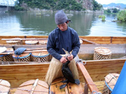 Surprisingly, there was almost no contest. Sure, when I arrived at the little pier (near Inuyama Yuen amusement park) where the cormorant boats were moored, the sight of those glorious birds crouching in firmly closed baskets sent my heart sinking, but the moment the 59-year-old supervisor Takayoshi Muto explained that "skinship is the most important thing in looking after the birds," things started looking up.