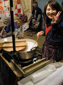 The crowds usually increase as the weather warms up, and by noon almost up to 9 p.m., people of all ages can be seen strolling along munching on the many tempting snacks on sale, such as yakisoba (fried noodles), niku manju (steamed pork buns) and cotton candy, and sipping cups of hot amazake, a sweet nonalcoholic drink made from the leftovers of the sake-brewing process.
