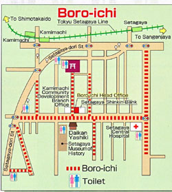 Setagaya Boroichi operates from 9 a.m. to 9 p.m. on Thursday, Jan. 15 and Friday, Jan. 16. If you buy a heavy or bulky item and have a long way to carry it home, ask the vendor to arrange shipment if possible (for a fee). Getting there: Some pay-parking may be available at lots in the vicinity, but the street itself is closed to all auto traffic. From Shibuya, take a Tokyu Bus (¥210) heading to Kamimachi Station, Seijo Gakuen or Soshigaya Okura for about 20 minutes to Setagaya Kuyakusho Iriguchi-mae or Kamimachi Station. Buses also run to and from Tokyu Bus Co.'s Tsurumaki Eigyosho from JR Shibuya and Meguro stations. From Shimo Takaido on the Keio Line, Gotokuji on the Odakyu Line, or Sangenjaya on the Denentoshi Line, transfer to the two-car Setagaya Line (¥140) and get off at either Kamimachi Station or Setagaya Station. On foot, the Boroichi is about 15 minutes from Komazawa Daigaku or Sakura Shimmachi on the Tokyu Denentoshi Line.
