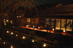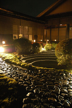 So the food's great — but the venue's better. Bamboo flutes serenade you up the lantern-lit approach to the main hall. Either side of the path are private dining rooms, one with a view of Go-Mizuno's old cushion seat, another with calligraphy from his Imperial hand, and all of them subtly decorated with the 16-petal chrysanthemum insignia of the Japanese monarchy. You're sitting in the Emperor's holiday house, eating his food.