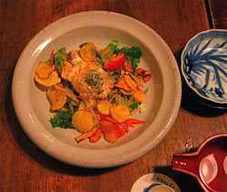 Up to this point, the meal was a succession of small dishes, each little more than a couple of mouthfuls. But the salad platter that followed had the look and feel of a main course. In the center was a mound of soft, freshly made tofu, surrounded by a vivid array of colorful autumn fruit and vegetables: salad greens and fat fingers of okra; sticks of eggplant, red pepper and carrot; persimmon and nashi, cherry tomatoes and even grapes.