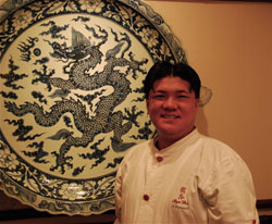 And then there are the Chinese ceramic platters. Set like trophies against the walls, there are more than a score of them, all in vibrant, spot-lit colors, some as big as shields. More light filters through washi-covered panels running in a narrow band just under the ceiling. With no windows, you are in a cocoonlike bubble of oriental opulence. There's no trace of Zen minimalism here — this is power decor for power dining, Ryugin-style.