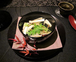 The suimono clear soup arrived in makie lacquer bowls of black and gold, decorated with fearsome dragons with red eyes and mouths. Removing the lids, our nostrils were assailed by the musky scent of matsutake mushroom along with the heady aroma of freshly made dashi soup stock. Yamamoto prepares the dashi from scratch, shaving the katsuo-bushi (bonito flakes) for each customer only after they have sat down and ordered.