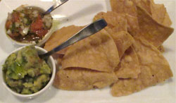 First up, a plate of chips and dips to go with that initial bottle of Lowenbrau (there's also Yebisu on draft, or Corona for the truly homesick). Instead of standard-issue corn chips out of the package, we were given a plate of crisp tortilla chips cooked in-house with a couple of tasty dips — a piquant homemade salsa with fine-diced tomato, pimento and onion; and a smooth, creamy guacamole. We were impressed from the get-go.