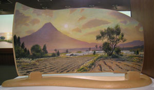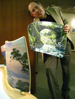 As the name suggests, this innovation refers to landscape paintings he does on custom-made panels that have both curved perimeters and curved surfaces that together create an illusion of depth and also express the eye movement of the painter as he looked at the scene.