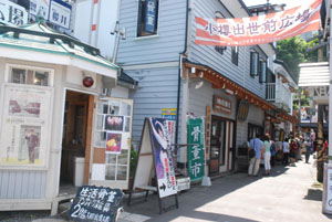 The signs are a good introduction to the distinctive Otaru atmosphere. Here's one, for example, identifying the former Tsukamoto store. Built in 1920 of reinforced concrete on wooden framing, now no longer in use, the shop looks as ancient as anything you'll see in Kyoto. Having been "originally built as a store for a dry-goods merchant from Omi, Shiga Prefecture, it is an example of the fire-resistant architecture that became widespread after the great Inaho-cho Fire of 1904 ravaged the city."