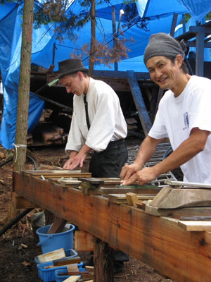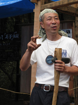Planing of that caliber was not being put to use on the teahouse under construction, however, since that was to have a more rustic charm. In fact, event organizer Amemiya could be spotted toting a tool favored by his Paleolithic ancestors — a stone axe with a wooden handle. Amemiya said he used to scorn such primitive tools, but since trying one out two years ago he had become enamored of its effectiveness and durability. He can chop down an 20 cm-diameter cedar in 15 minutes with the axe, he said.