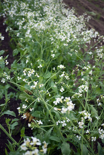 Motegi did not suffer major earthquake or tsunami damage. But soon after the hydrogen explosions at the nuclear power plant, radiation contamination was found on some vegetables grown in nearby prefectures, including Tochigi itself. While Tamayura Soen's vegetables were not contaminated, Toyoguchi pulled up most of the greens and left other vegetables to go to seed, unsold. Newly sown vegetable seeds are just now coming up, ready to plant anew. Tamayura Soen was able to salvage the carrots and some other vegetables, but its regular customers, who buy its produce for its chemical-free qualities, have not been requesting them much.