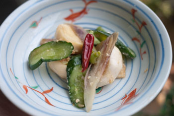 Prepare the vegetables: Cut the cucumber in half lengthwise, and scoop out the seeds if preferred. Peel the ginger and slice. Cut the myōga lengthwise into slices. Take the green tops off the turnips, leaving a small piece on the roots for color (keep the greens for use elsewhere). Peel the turnip roots rather thickly for the best texture and flavor, cut into quarters and slice.