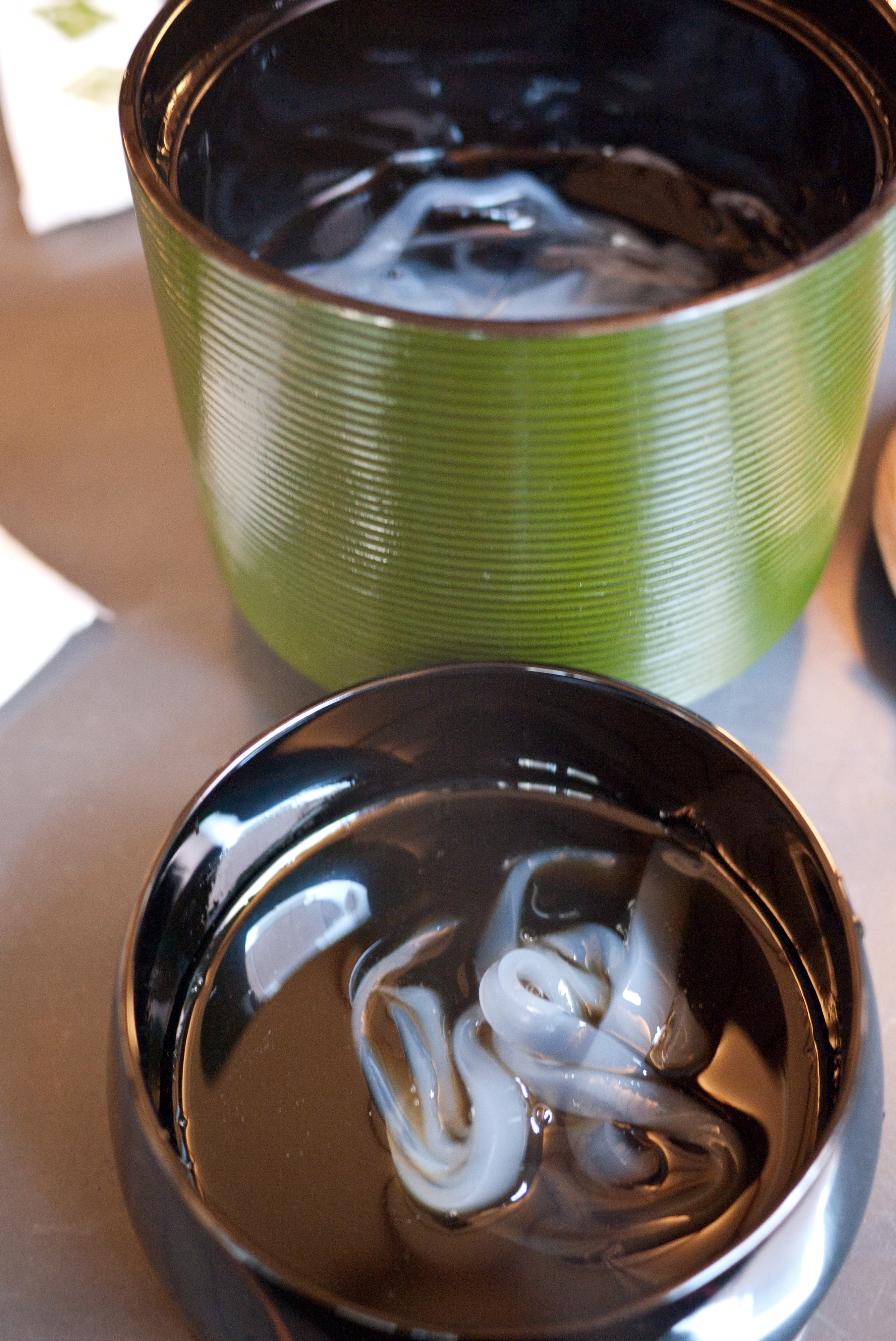 In the summer months, slippery, transparent ingredients such as kanten (agar-agar) and kuzu, or kudzu, are used to make namagashi that appear as refreshing to the eye as they are to taste. Kanten is usually used to form transparent jellies with a chilled appearance. A quintessential summertime treat is kuzukiri, slippery noodles made of kudzu that are served cold with a sugar-syrup dipping sauce. Enjoying kuzukiri while sipping on a glass of iced matcha is an essential Kyoto summertime experience.