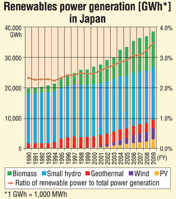 Meanwhile, despite some early government support, power from solar, wind, geothermal, biomass and hydropower plants with a capacity of 10 MW or less languished at 3.4 percent of the total electricity supply in 2009, according to a report by the Japan Renewable Energy Policy Platform; adding in large hydropower plants brings the figure to about 9 percent, according to government figures.