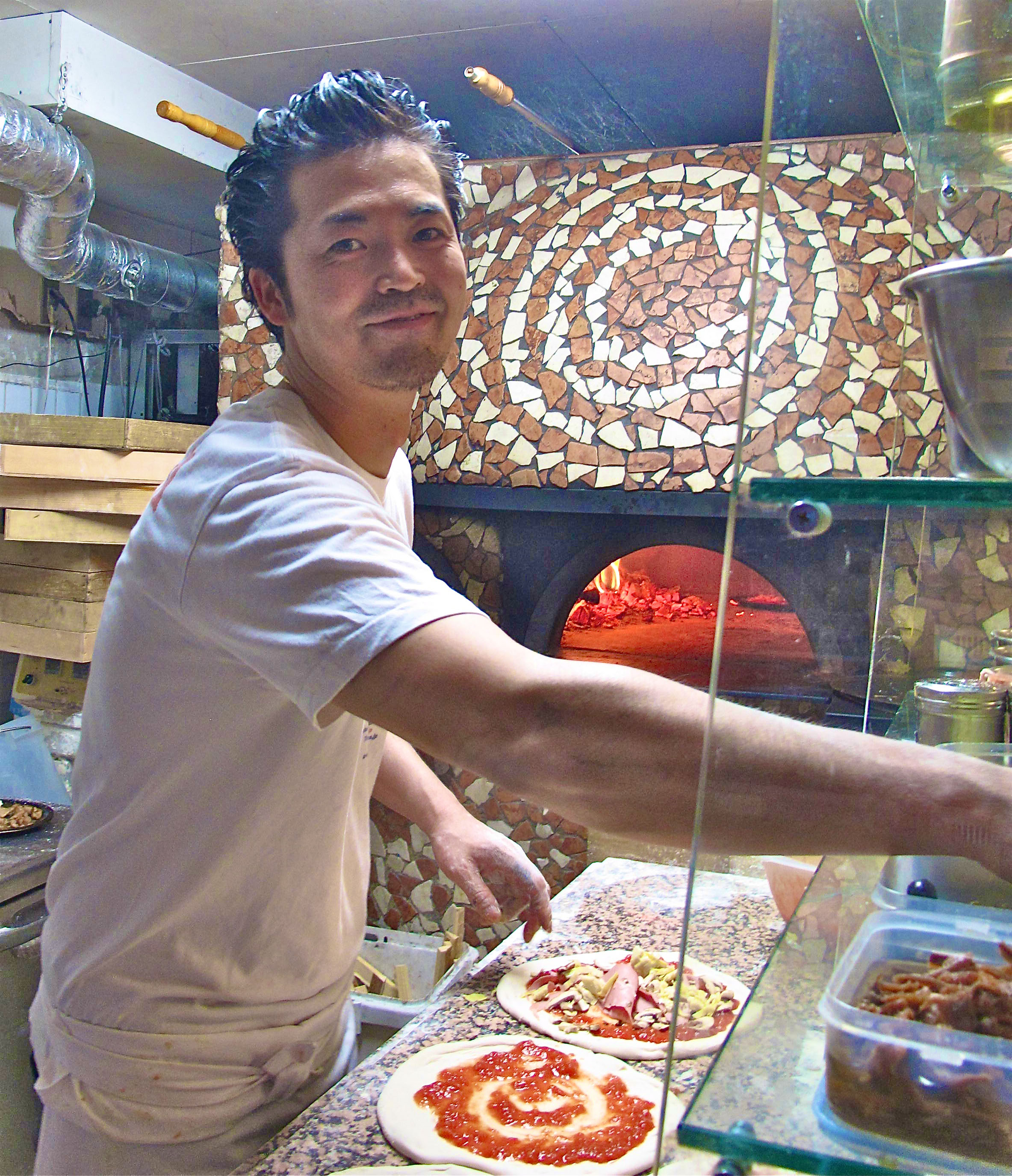 Even if Yamamoto weren't so busy — he works solo at his oven from opening time until the last order — he's not interested in putting on a show. He doesn't throw the dough around or twirl it in the air: He just fashions it roughly into shape with his hands, before scattering the toppings in place. The finished pizza may not be perfectly circular. But who cares?