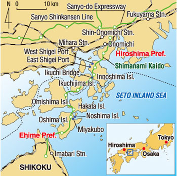The route that now traverses between the Hiroshima and Ehime mainlands is known as the Shimanami Kaido. Fortunately, though, this series of island highways linked by elegant bridges that's primarily designed for motor vehicles is also bicycle-friendly, since most of those bridges have a lane for cyclists and pedestrians. As well, there are several rent-a-cycle shops en route that allow you to return your bicycle to any of the others merely by forfeiting your deposit.