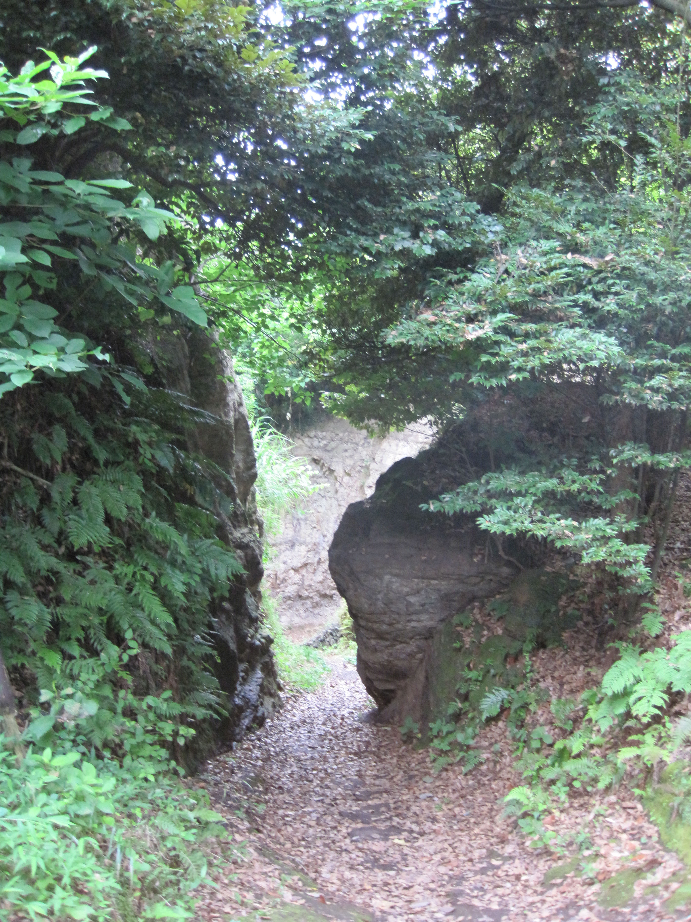 There, a signpost in Japanese and Romaji directs you to the Nagoekiri-doshi Pass, one of the famous seven ways into Kamakura in ancient times. Taking a few steps in the indicated direction reveals the sight of a narrow opening cut between two cliffs — all the better for holding off intruders.