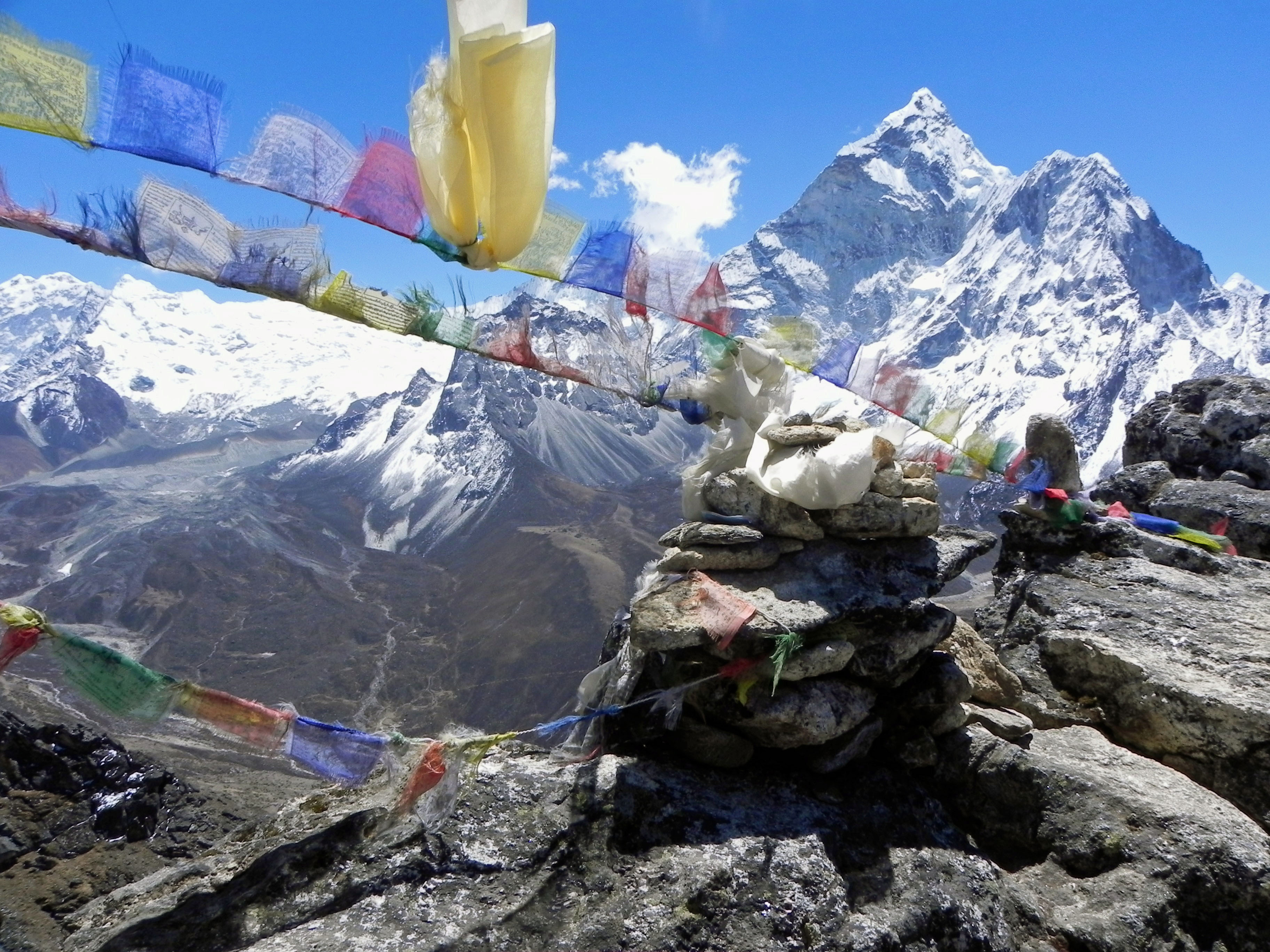 Owners of popular teahouses have grown rich. Our next stop after Namche is at a place called Kyangjuma, home to a guesthouse that rapidly becomes everyone's favorite (we overnight here on the way back, too). We breakfast outdoors at long tables with a view of Ama Dablam, reputedly the most beautiful mountain in the Himalayas. "I spend the winter in Colorado," our hostess explains, as she tops up our mugs with steaming tea. She has also put all her children through university. After we've eaten, she invites us into her family prayer room. It is full of brightly painted carvings, shells, seeds and flower-strewn photographs of lamas — superb local craftsmanship, all paid for with tourist cash.