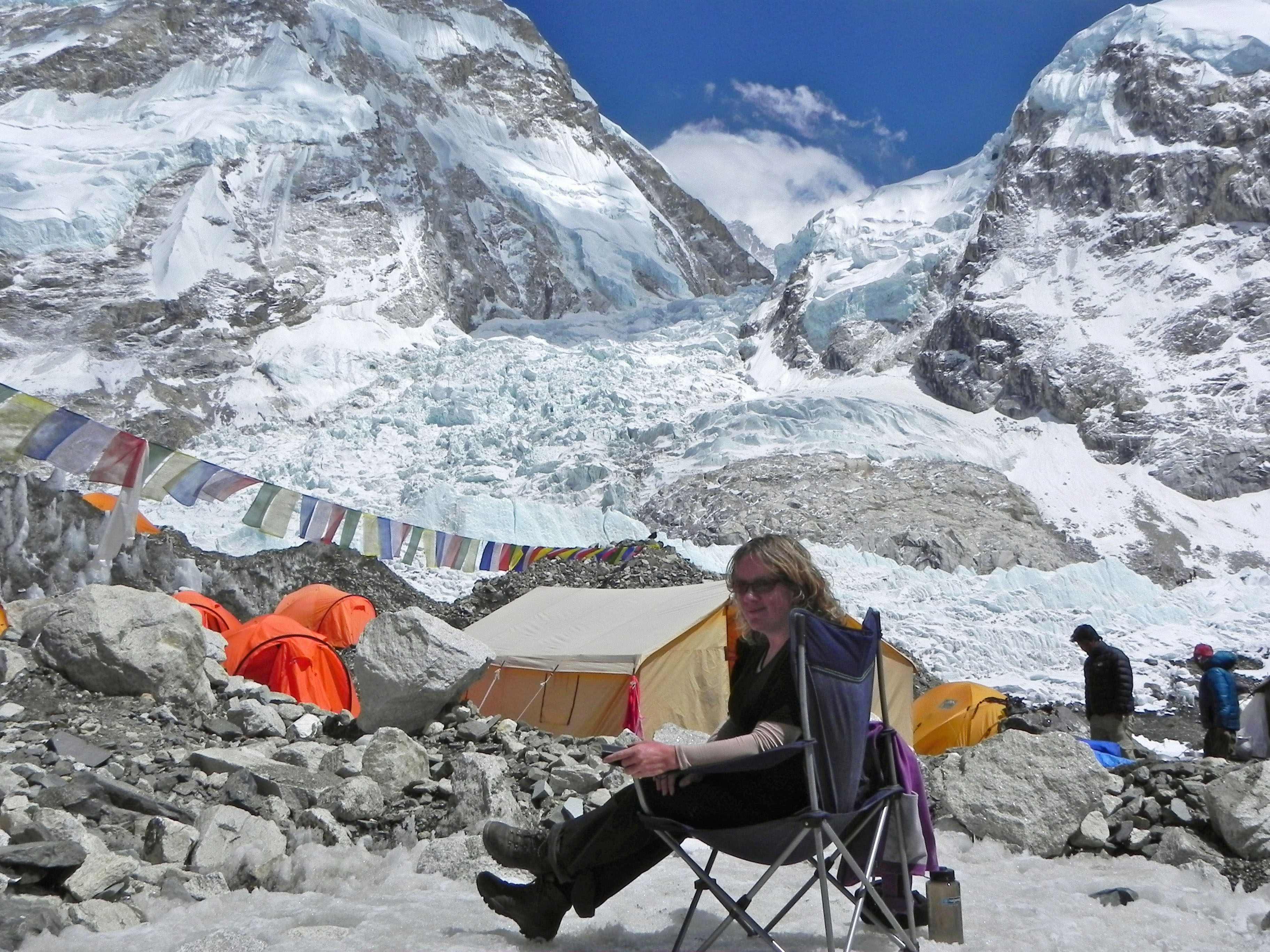 Our camp occupies a prized spot near the Icefall, a zone of great danger into which, by necessity, only would-be summiteers venture. Our tents — and all the others here — sit directly on top of the glacier. Beneath us, the ice is discreetly covered by a thin layer of rubble, but just a few meters away it gleams nakedly blue-white. Sometimes, we learn, bodies pop out of the glacier — those who died on the mountain or in the Icefall, given back by Miyolangsangma years later. I see that our camp is next to the hospital tent, the renowned Everest ER, and I text this info to my mother to reassure her.