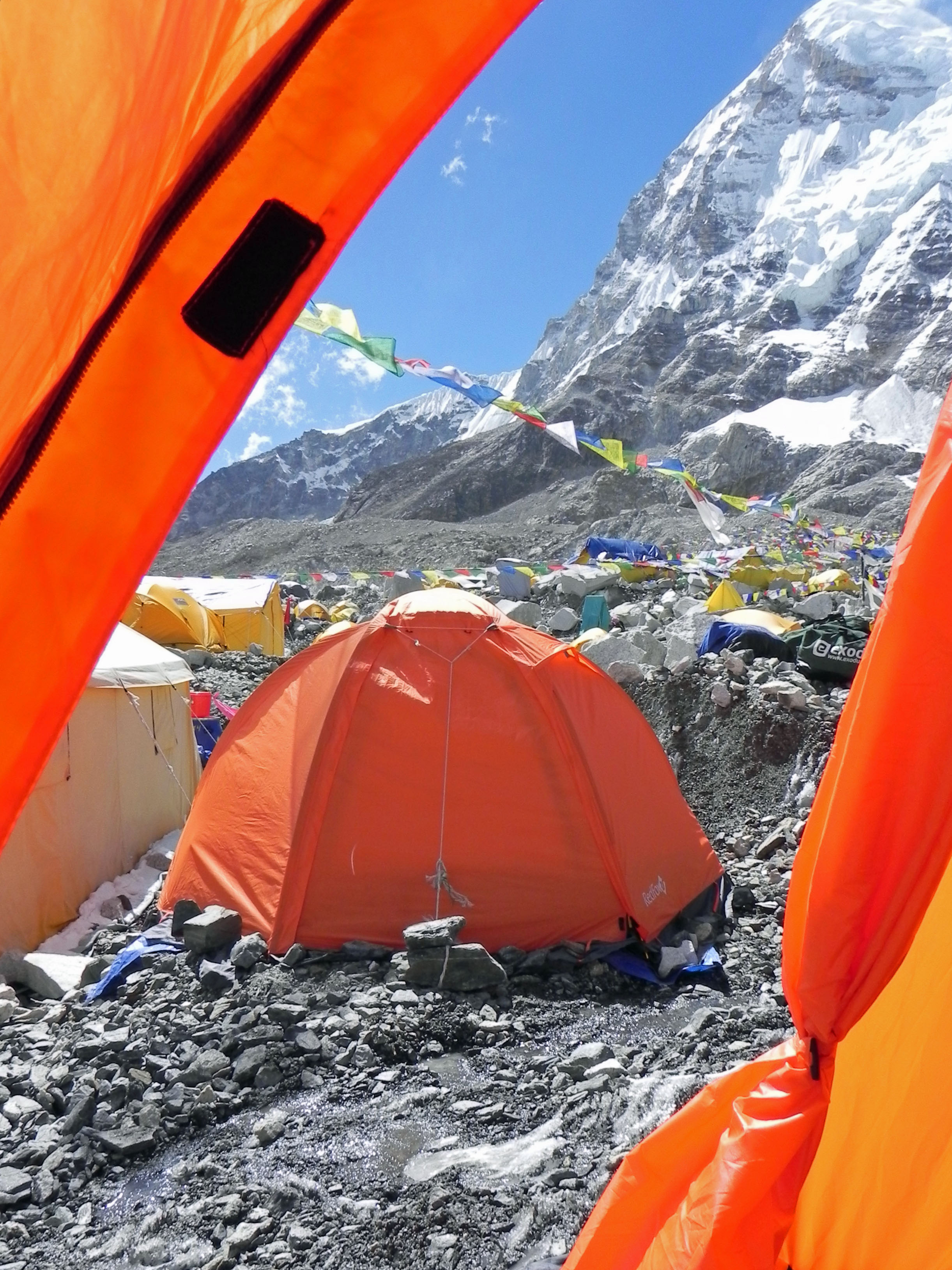 From a distance, Everest Base Camp appears no more than a handful of yellow tents, scattered like breadcrumbs on the rocks near the deadly Icefall, from which flows the Khumbu Glacier. Up close, it is a sprawling settlement that takes an hour to cross from end to end. Each expedition stakes out its camp around large dining and kitchen tents. Some erect small shrines strung with multicolored prayer flags, where Sherpas ask the blessing of the mountain goddess Miyolangsangma before attempting their first ascent of the supreme summit, known to them as Sagarmatha. The air is one-part ice, one-part incense and one-part garlic, and it hits both nostrils and taste buds simultaneously.