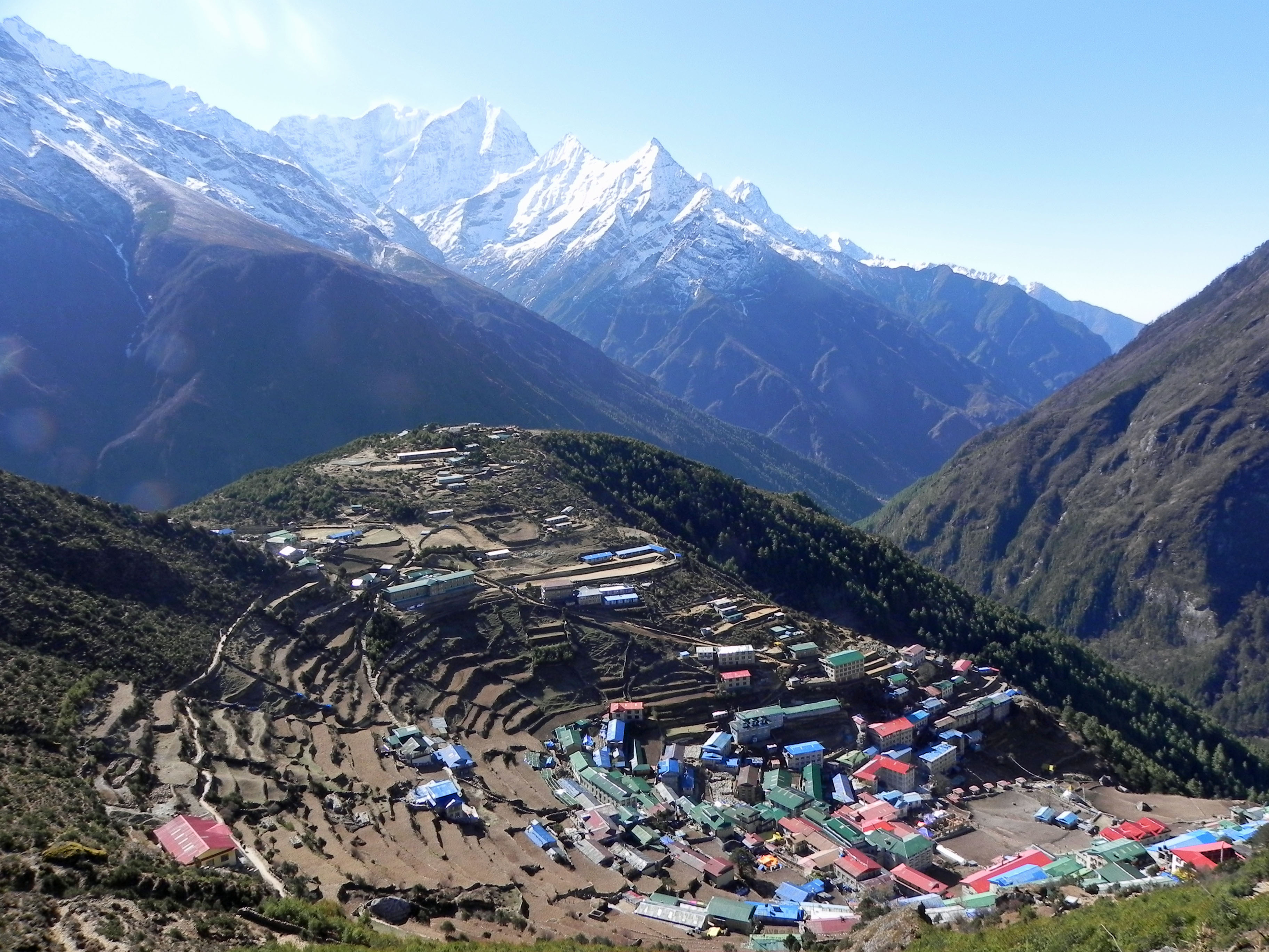 And then we're there: Namche, nested between forking mountains. Given the walk we've had — the same route that everything which comes here must travel, carried on two legs or four: food and drink, gas and oil, even building materials — it seems impossible that a community of this size can be supplied and sustained. And yet the town thrives. Above the horseshoe-shape streets are tier upon tier of earthen terraces, currently cultivated, but providing space into which it can expand.
