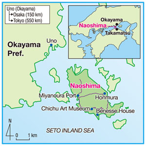 Getting there: There are regular ferries from Uno and Takamatsu to Miyanoura Port. Marine Station Naoshima has an information office, cafe and bicycle-rental counter (¥500 per day). There is an infrequent bus service around the island.