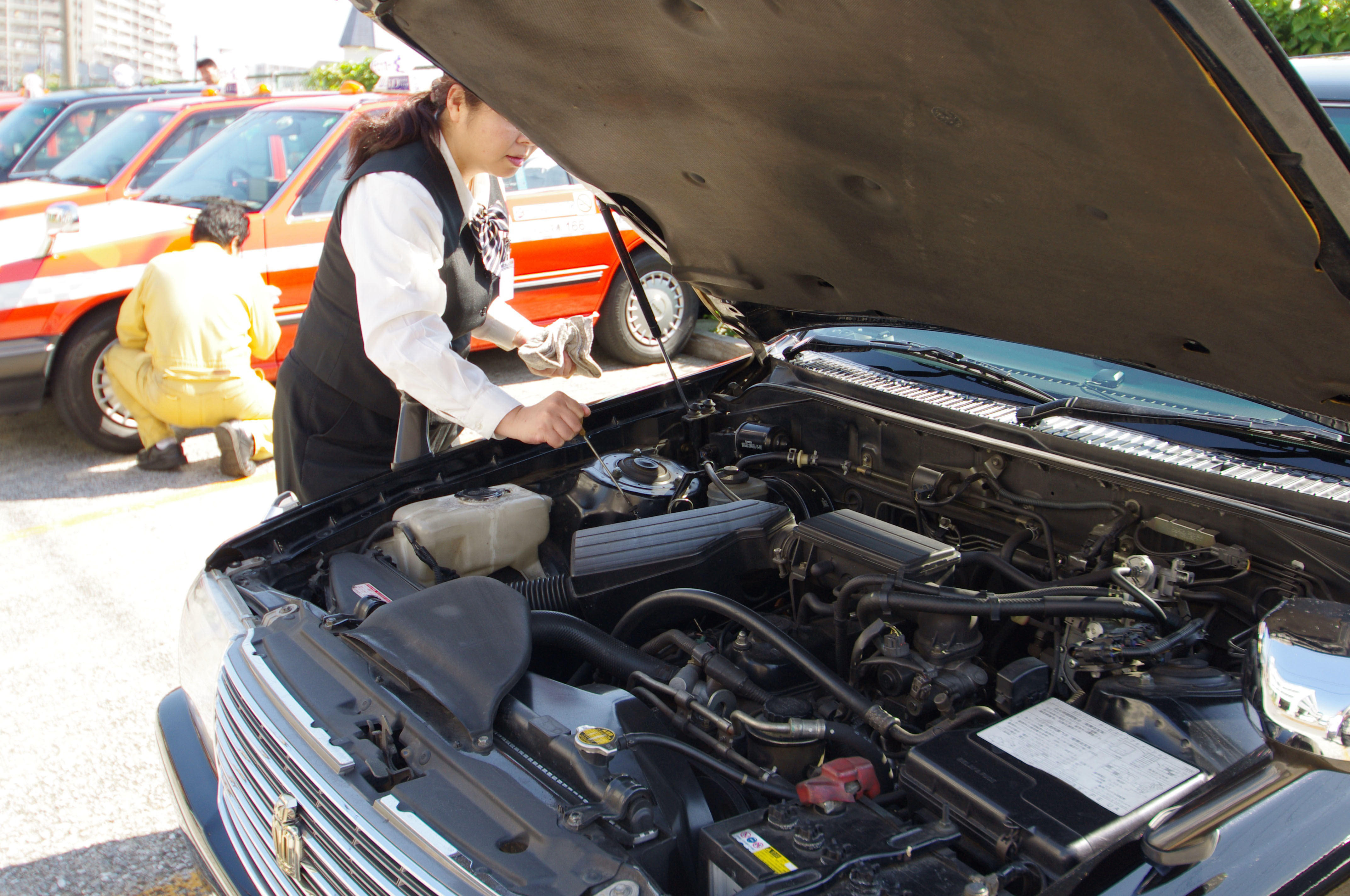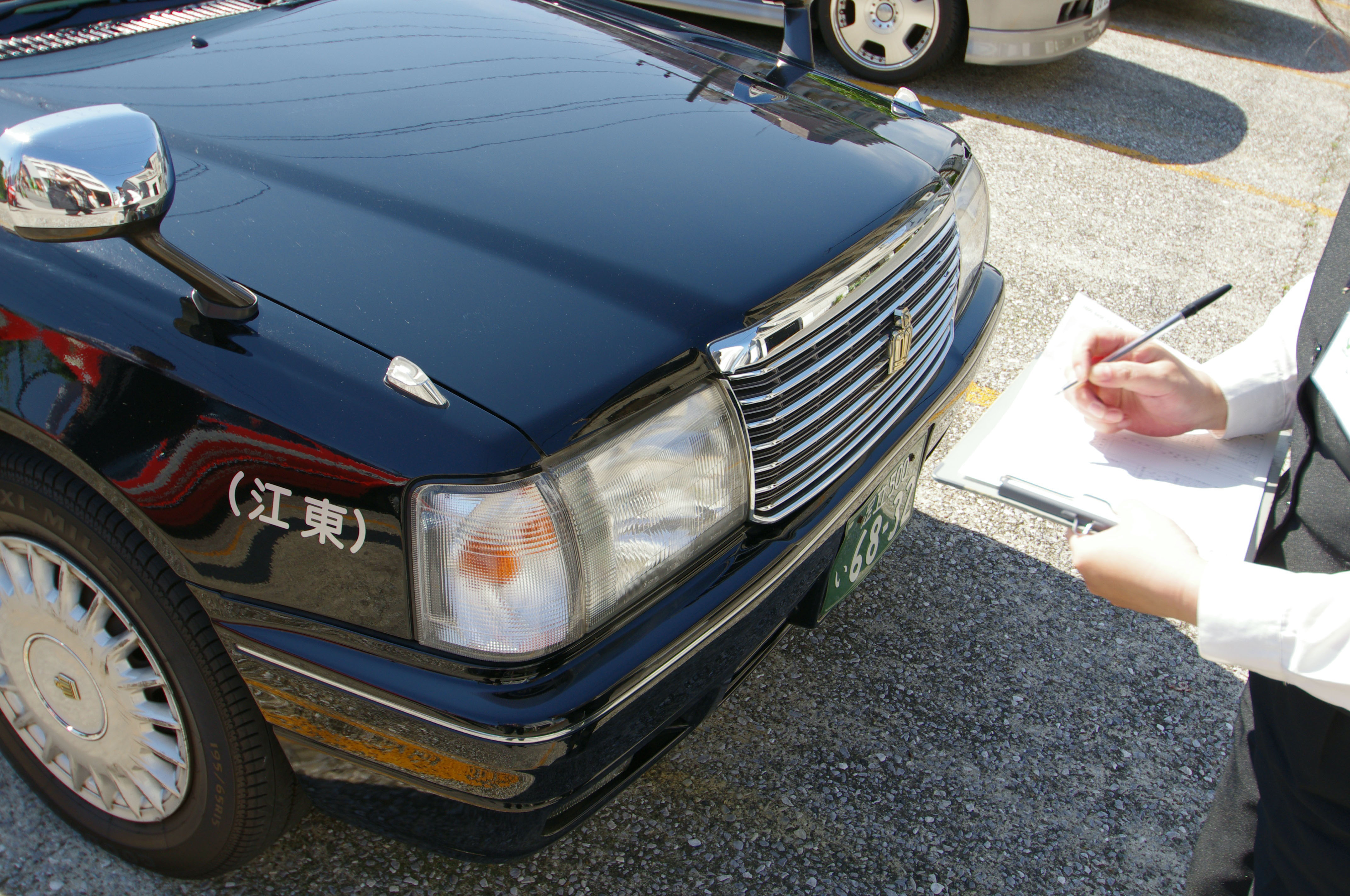 Next, Hosoda was handed a clipboard bearing a checklist of things to do before starting off. The form includes a diagram of a car, upon which any existing nicks and scrapes are to be noted.