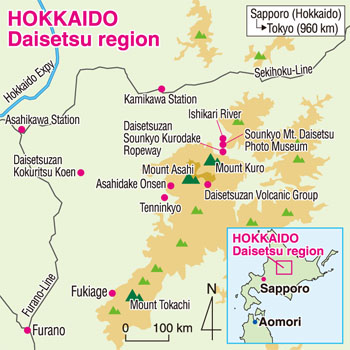 Getting therestyle="font-size:1.4em;">Trains and flights make Sapporo, Hokkaido's capital, eminently accessible, and from there it is an easy journey by train and bus or by rental car to either Asahidake Onsen or to Sounkyo to reach the gondolas. There are direct buses to Sounkyo from both Asahikawa and Kamikawa stations, making this one of the most easily accessible mountain areas of Hokkaido. Souvenirs to buy include delightful postcards, photographic books of the area, and the local Sika Deer sembei crackers. |