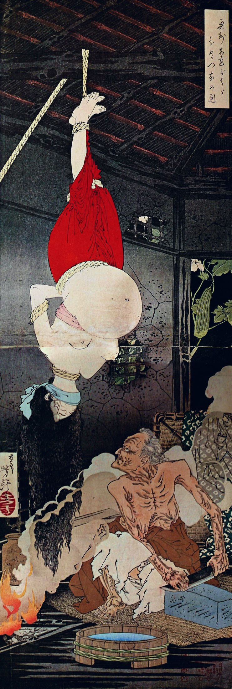 The pair of prints comprising Yoshitoshi's famous vertical diptych on the Onibaba theme show a young female, bound, gagged and suspended head down from the ceiling by a rope. She is hugely pregnant, and her long hair dangles close enough to the hearth to be licked at by its sparks. The cackling Onibaba squats on the floor, her wrinkled torso bare from the waist up as she hones her knife to a sharp edge on a whetstone.
