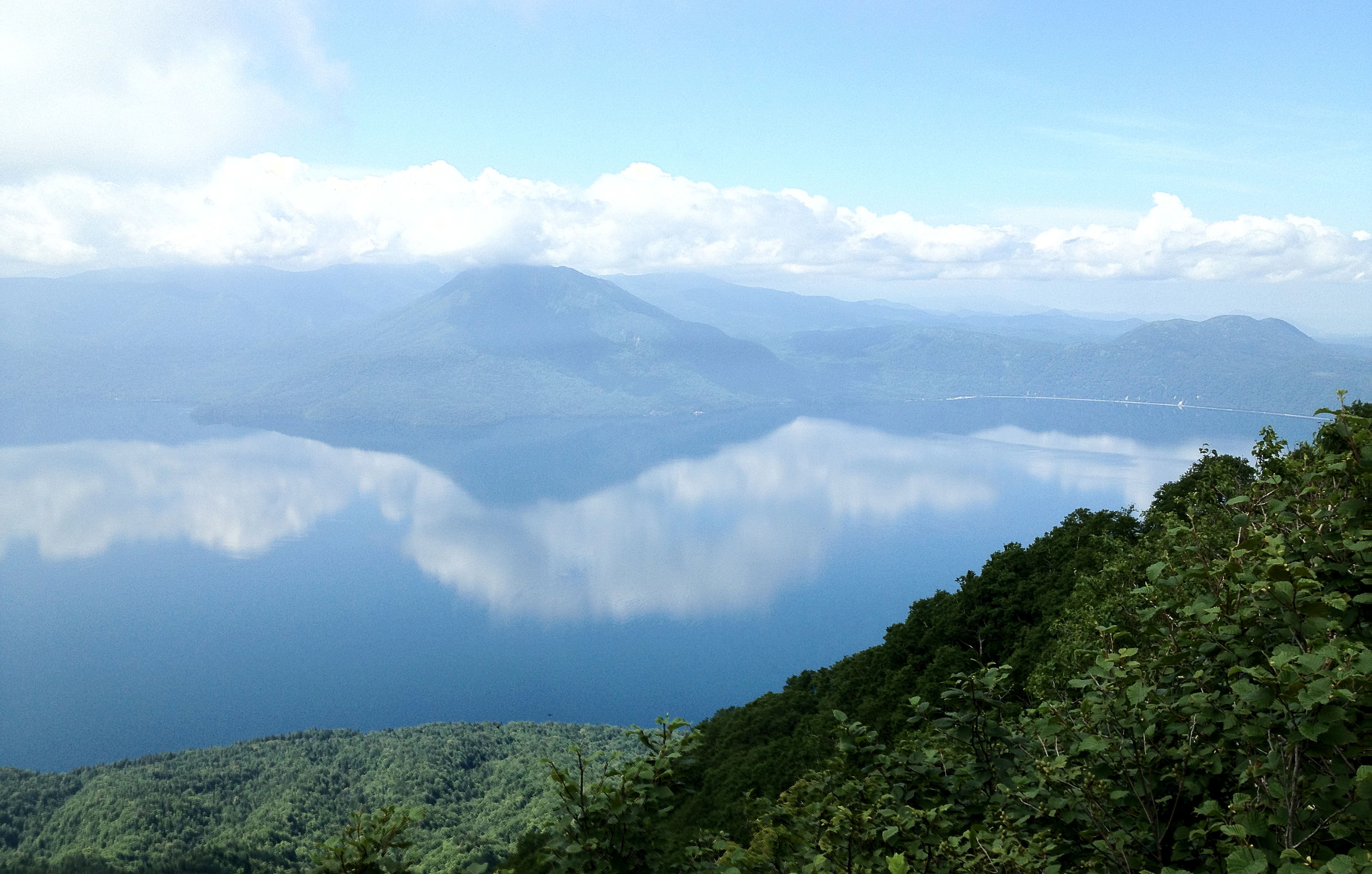 A direct road to the lake from Sapporo, Route 453, leaves the city through Ishiyama in Minami Ward, passes the enticing Sapporo Art Park and then winds through forested hills before sweeping up and over the caldera rim and descending toward the lake past the trail head for Mount Eniwa. It is by the final hairpin bend on this approach from the north that there is the viewpoint overlooking the eastern third of the lake.