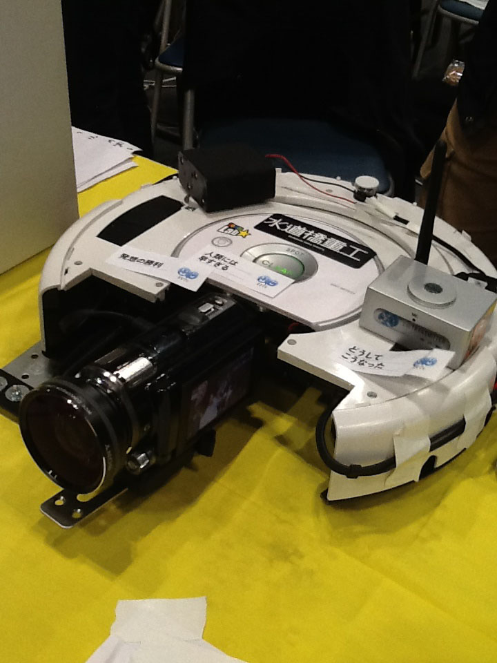 Hiroshi Takai, who runs a firm named Log film Inc. in Tokyo, presented "Low Angler No.3," which is basically the popular Roomba robot vacuum cleaner equipped with a video camera.