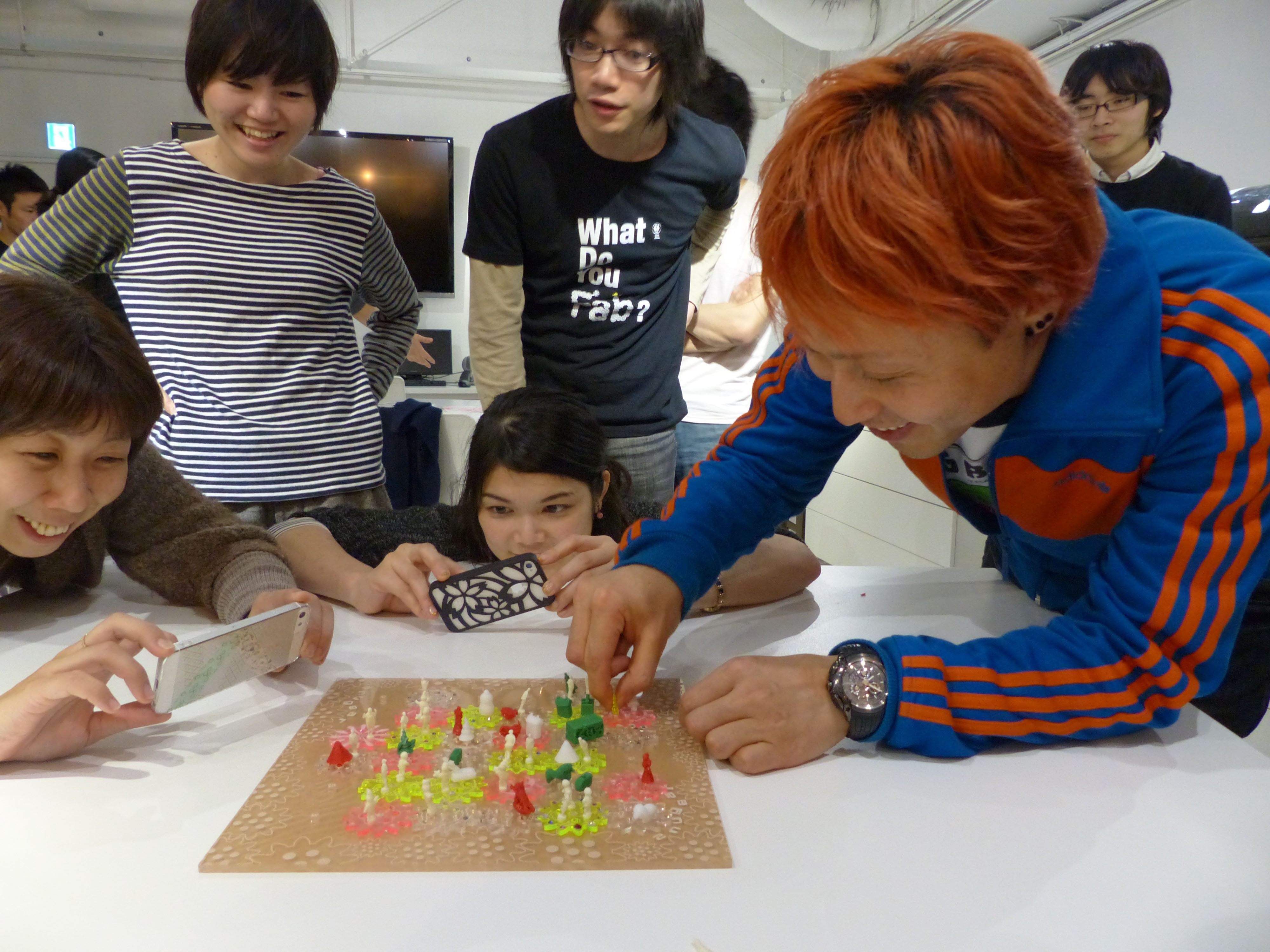 At the end of the FabCafe workshop, when all the participants had their objects printed out and their cogs laser-cut from a plastic sheet, Nezu asked everyone to join all the cogs together and then turned one of them. As the cogs started turning so too did the objects placed on top, as if they were dancing on a carousel. Seeing their creation come to life, the participants started tweeting and Facebooking the scene right there.