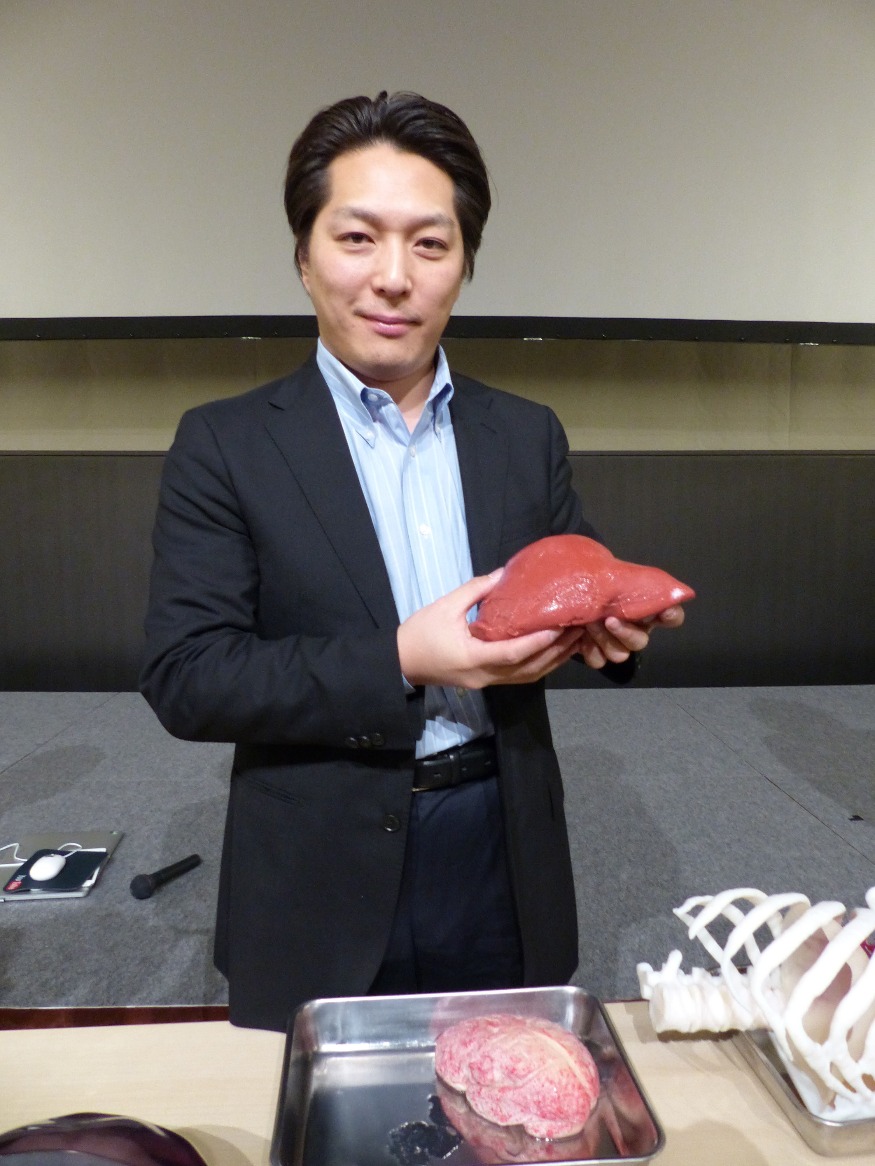 In addition, Sugimoto is working with a craftsman at an artificial-blood-vessel-making factory to develop "hybrid" models, which are partly made using a 3-D printer and partly by handiwork, he said. Such models can be soaked in water to look and feel even closer to real organs. He showed off one of the liver models at the seminar, which looked and felt exactly like a reddish-brown beef liver you might buy at a supermarket. "We are in an age when we need to make (medicine) not only visible, but touchable," he said. "And to combine the benefits of both the virtual and real worlds." (T.O.)