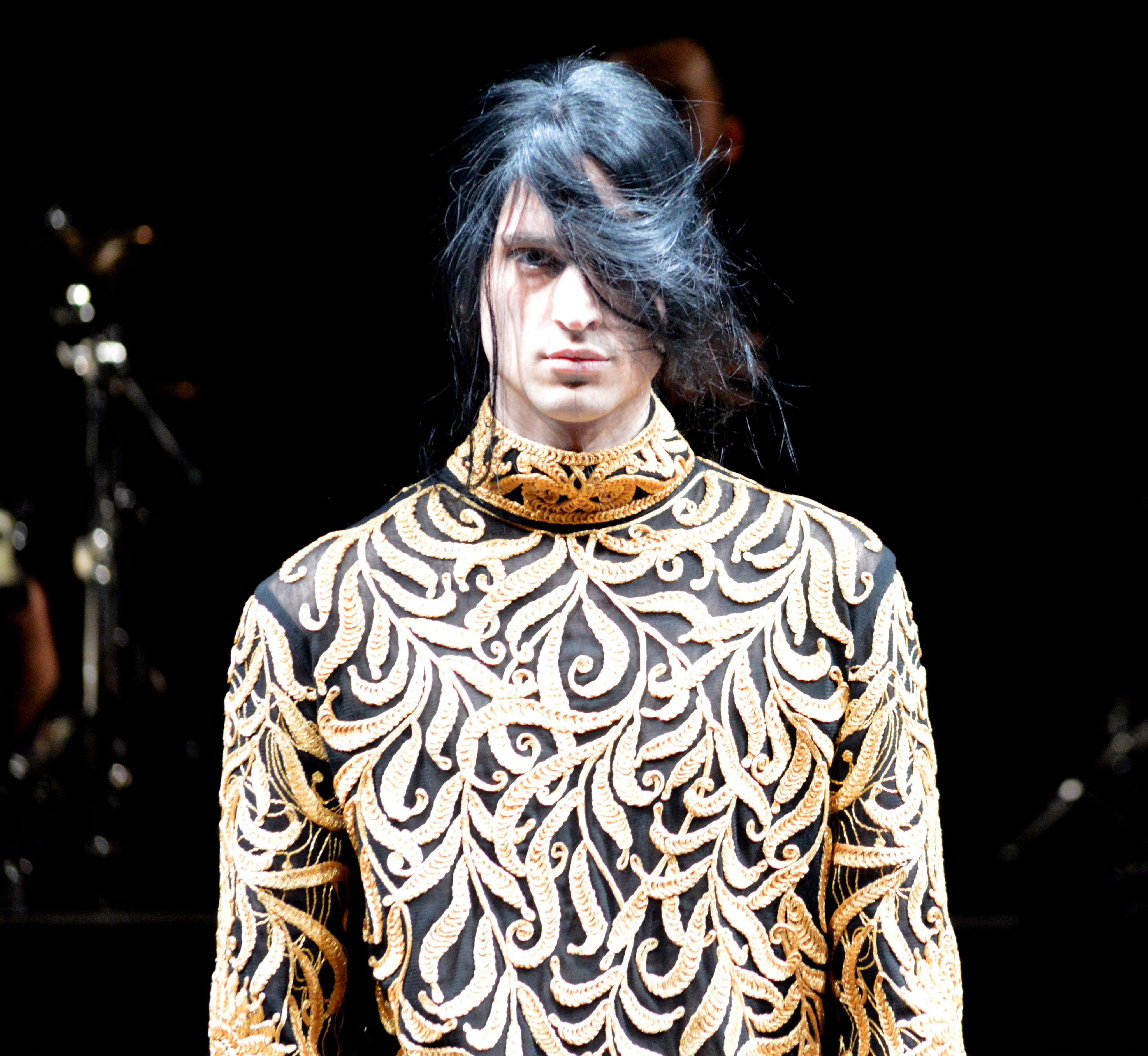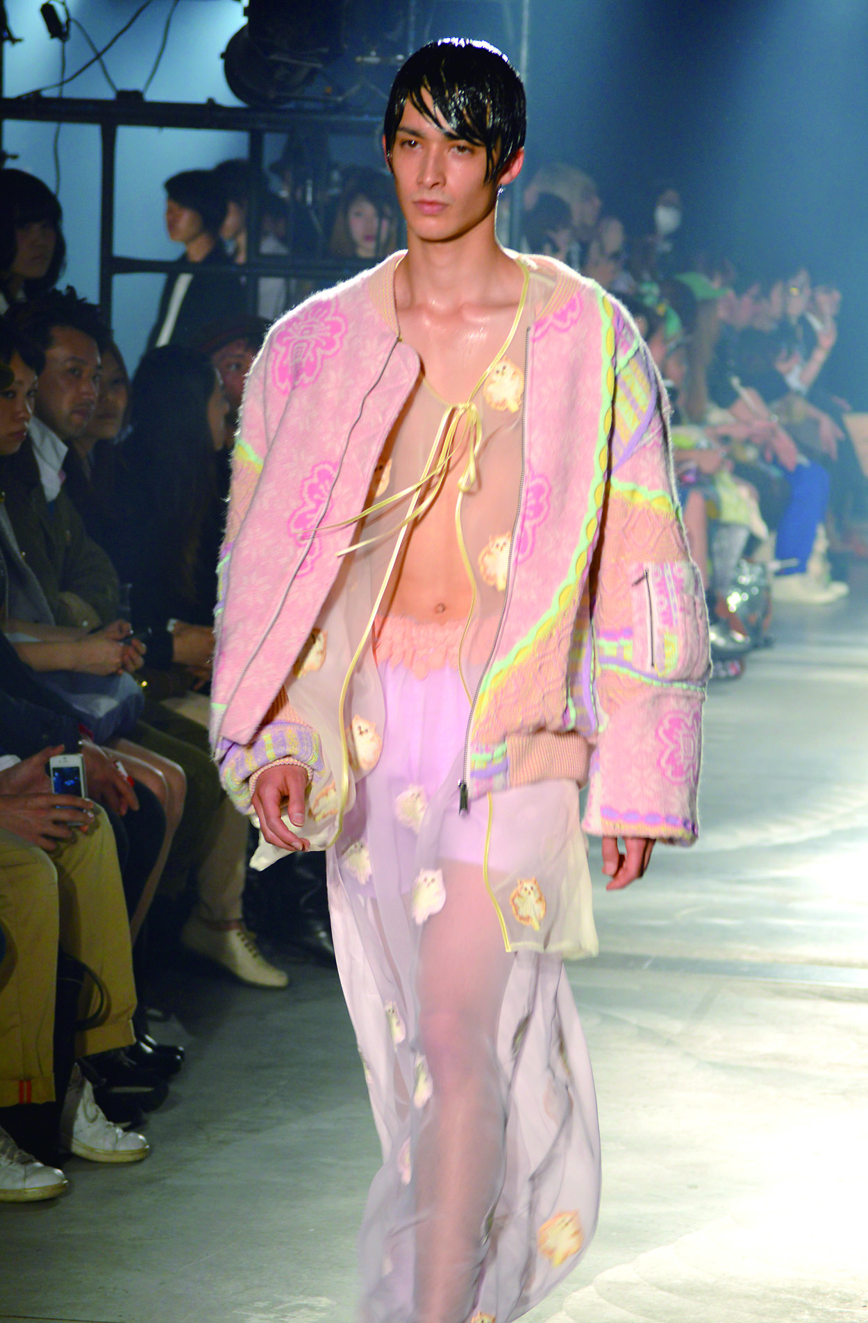Bucking that trend with unexpected showmanship was cult brand Mikio Sakabe, whose creations drew gasps from a packed audience as a gaggle of boxer short-clad oiled models hit the runway in pink nightdresses, sakura petal-strewn overcoats and Japanese high school girl-inspired tailoring. It was a play on gender and fetishization of youth in Japanese society that may have bordered on the avant garde at times, but the number of men in attendance wearing Sakabe's head-to-toe pastel creations showed that his vision is taking hold.