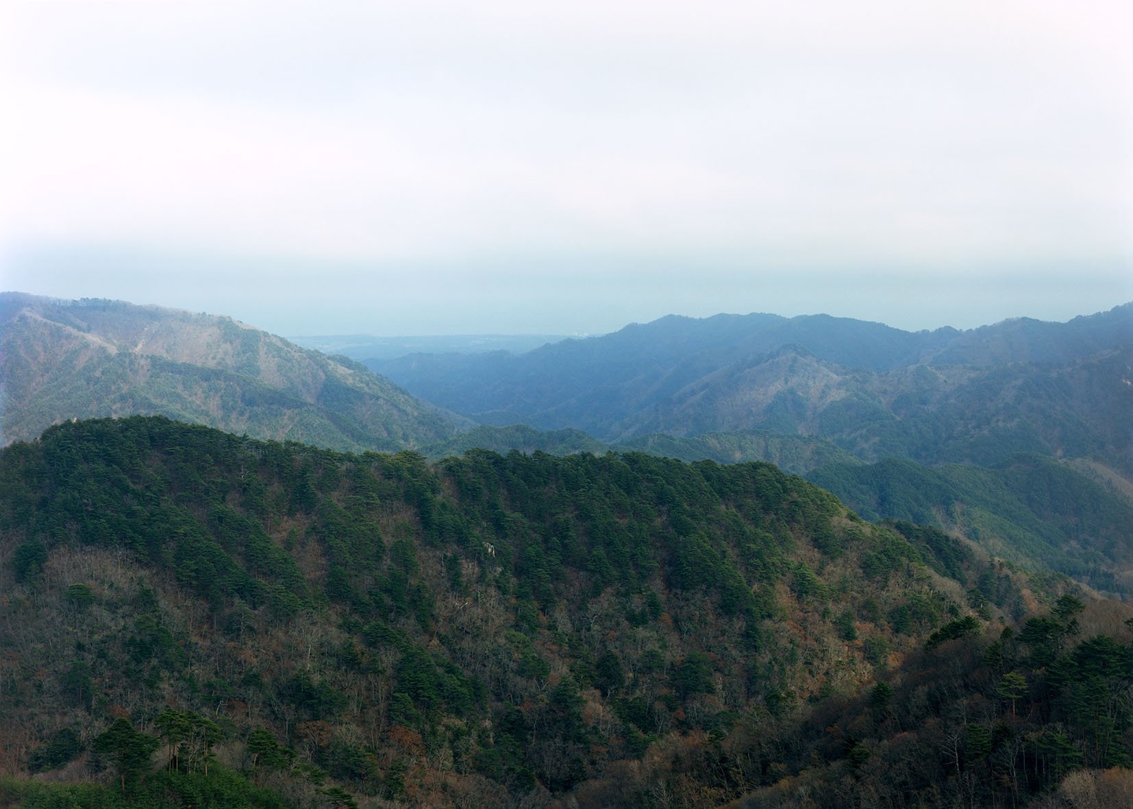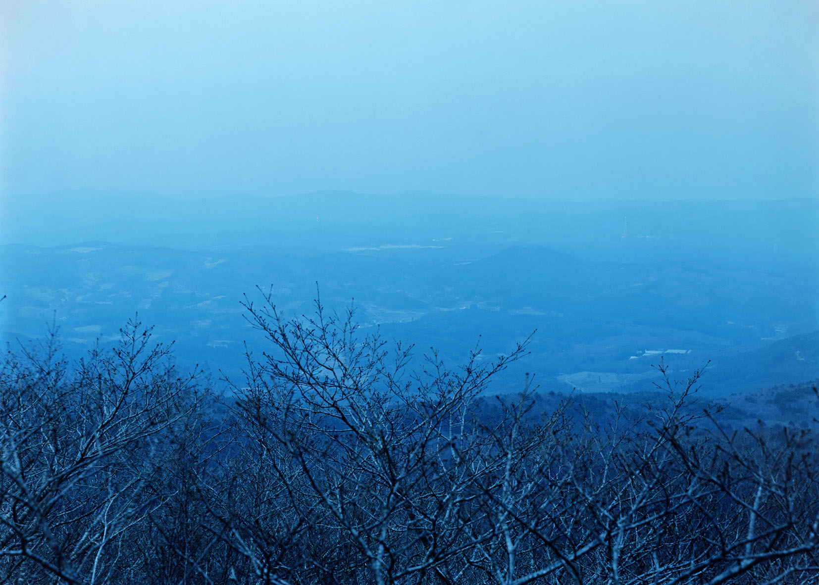 The culmination of two years' work, "Semicircle Law" — unlike the apocalyptic images now generally associated with Fukushima's nuclear tragedy — reflects a more subtle approach Imai resolved on adopting. Hence, during each of his nearly 20 visits to the region, he donned hiking boots and — toting his large-format camera and a tripod — climbed 18 peaks within a 30-km semicircular radius of the coastal Tepco plant (because the other half of the semicircle is over the Pacific). Once there, he checked the compass bearing and trained his lens on the nuclear facility.