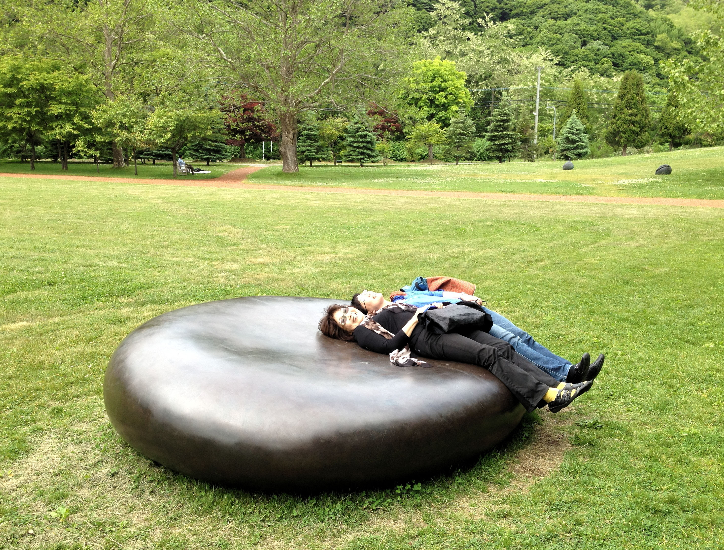 That some of the works resemble the heavy wave-washed granite boulders I was tempted to carry home from the beaches of Okushiri Island off southwestern Hokkaido, or water-polished rocks in the headwater streams of the Ishikari River, may merely be coincidental — but like them they are intensely tactile, inviting touch, encouraging one to sit on them, to pause and reflect on life and the natural surroundings — or to recline on them and sky-gaze.