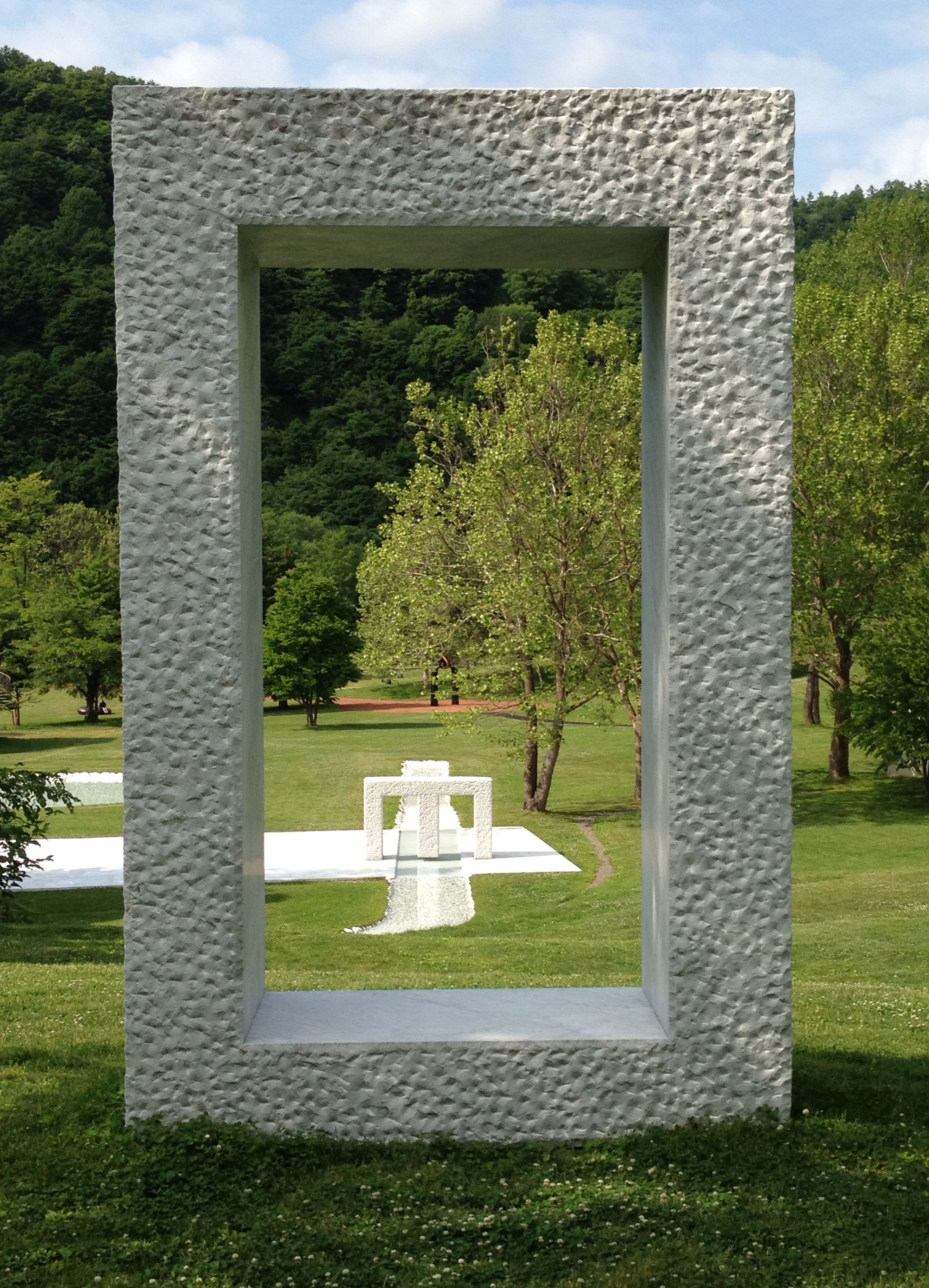In his dark bronzes I see echoes of the past, mourning for lost miners, for the town's lost children, indications of the pall of coal dust that must have pervaded the area. But in the whiteness of his works in Italian marble, I see the beautiful pristine draping of winter snows bringing beauty to an industrial landscape. The setting here is so surrounded by nature that seasonal colors make repeated visits enticing, to see the pieces offset against a blue summer sky, against the vibrant oranges and reds of autumn, the fresh greens of spring and their contours further softened by a fresh coating of powder snow.