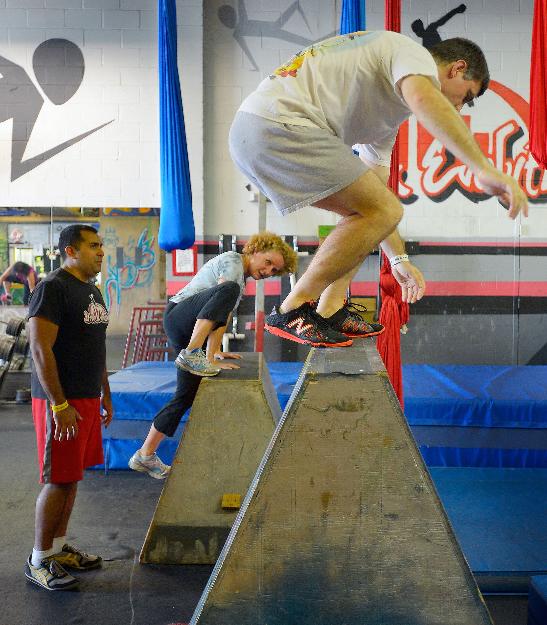 I was a bit shaken (not stirred) when we moved to a meter-high railing made of steel pipes, the kind you might find on any city street. Maniktahla told us to jump from a box to the rail, turn and walk the railing. (We were allowed to hold on to a vertical pipe while pivoting our feet from the landing position.) A fall to the left would land me on a thick cushion. A fall to the right would bounce me off a sharp-edged wooden vaulting thing. And a split — well, I didn't really want to think about that.