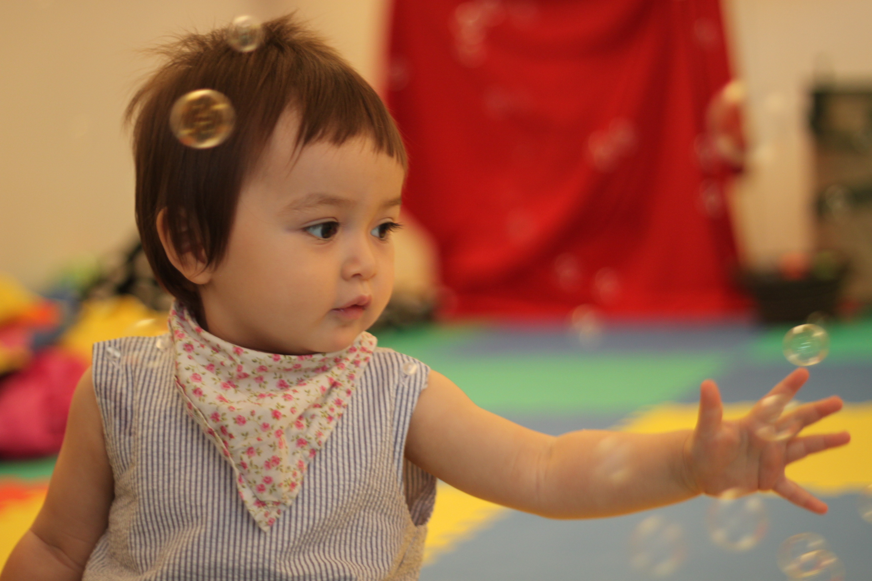 The hour-long class continues with a similarly colorful array of songs and entertainment, involving among other things, a large furry brown bear, butterfly puppets on fingers and — Kiko's favorite — a bubble-blowing session.
