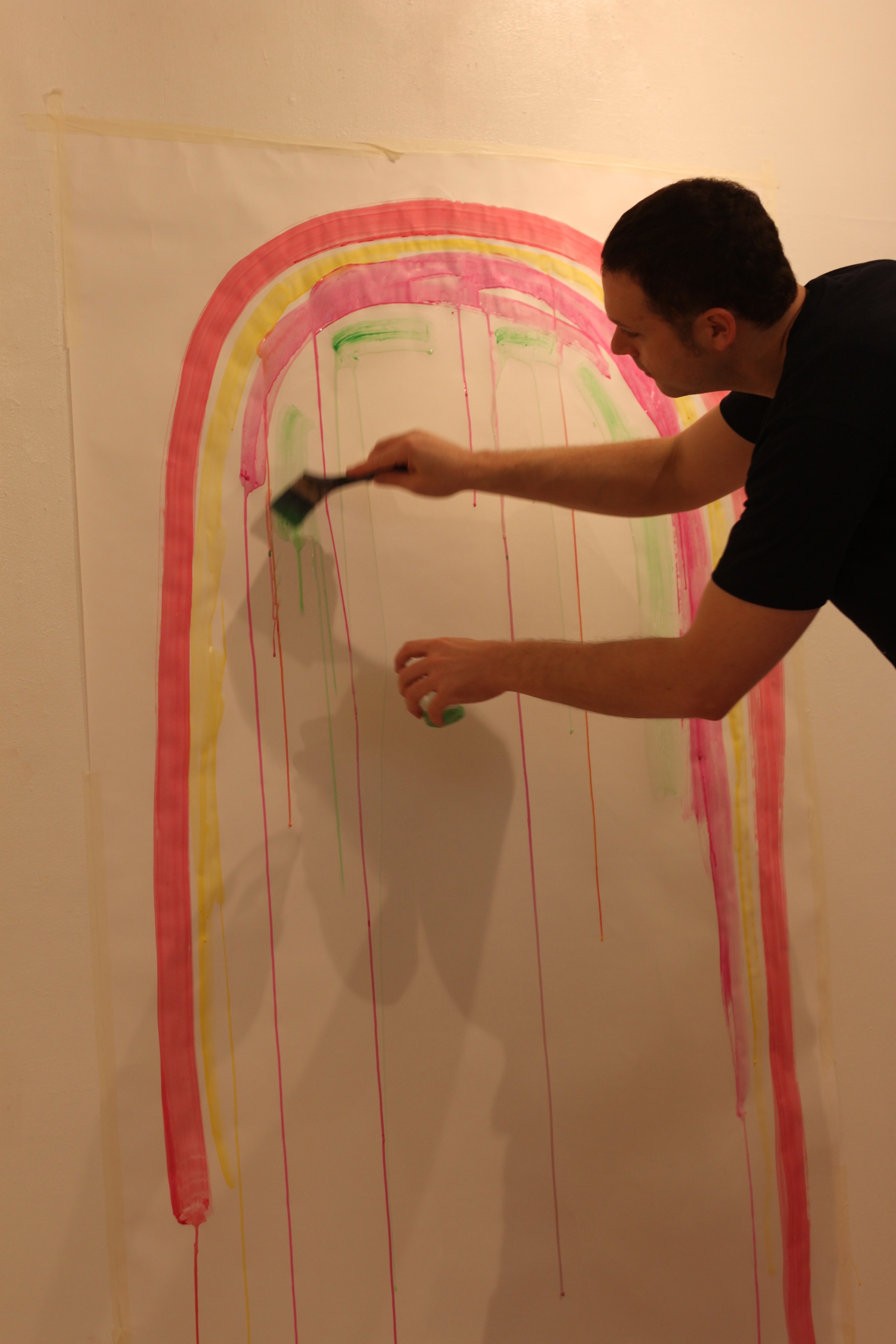 It is hypnotic stuff for babies: from the live music all around to the bright dripping colors that appear as if from nowhere on the large white sheet of paper hanging on the wall.