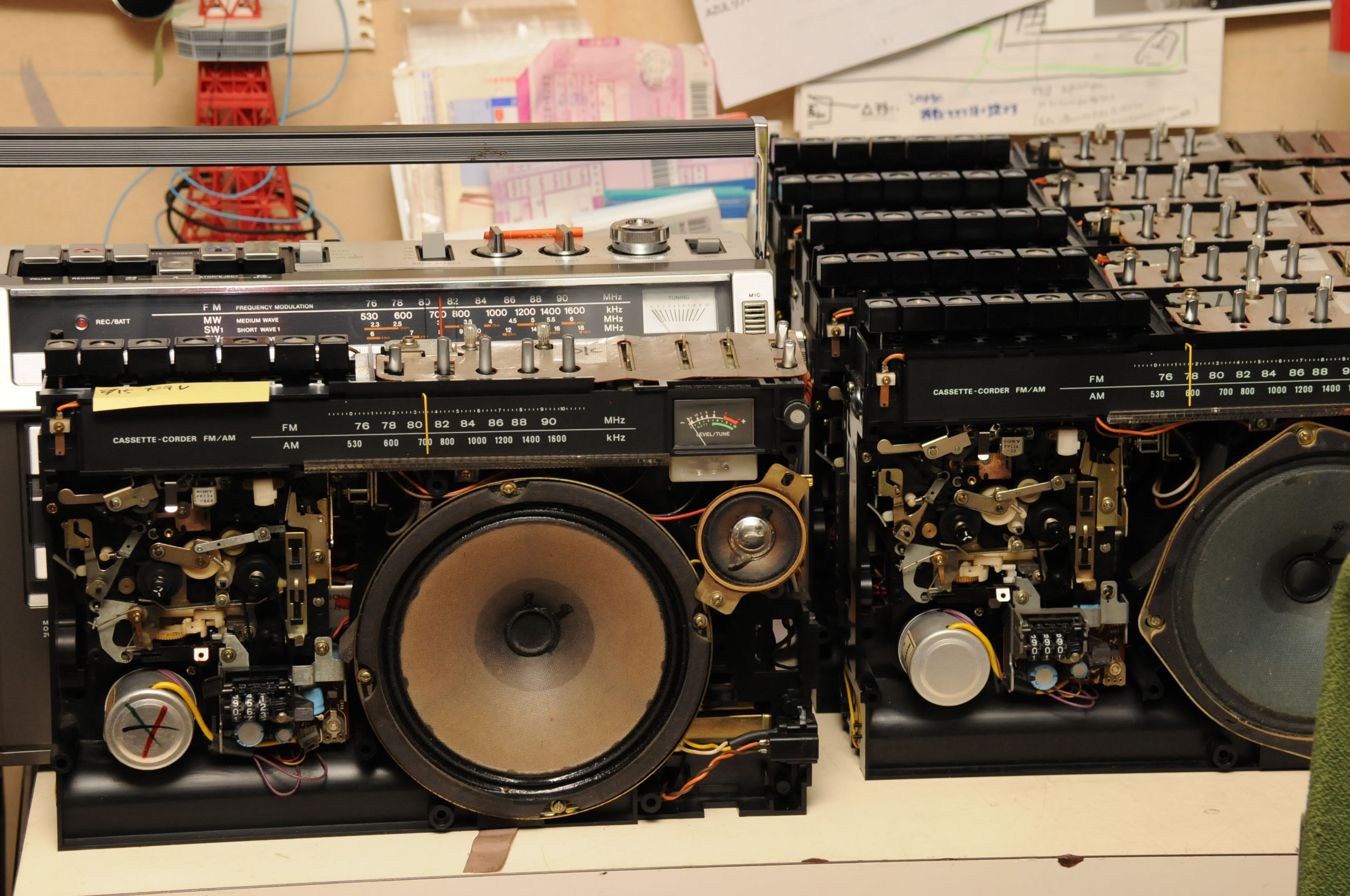 When he can't find parts to replace the broken ones, which is often the case because manufacturers are reluctant to stock replacement parts in-house, he gets new ones made just for him. He showed me one of 20 identical Sony single-cassette players that he has collected and is trying to fix. The 1973 black model still had no plastic cover on, exposing a circuit board, a bunch of parts and cables and a speaker half the size of the entire machine.