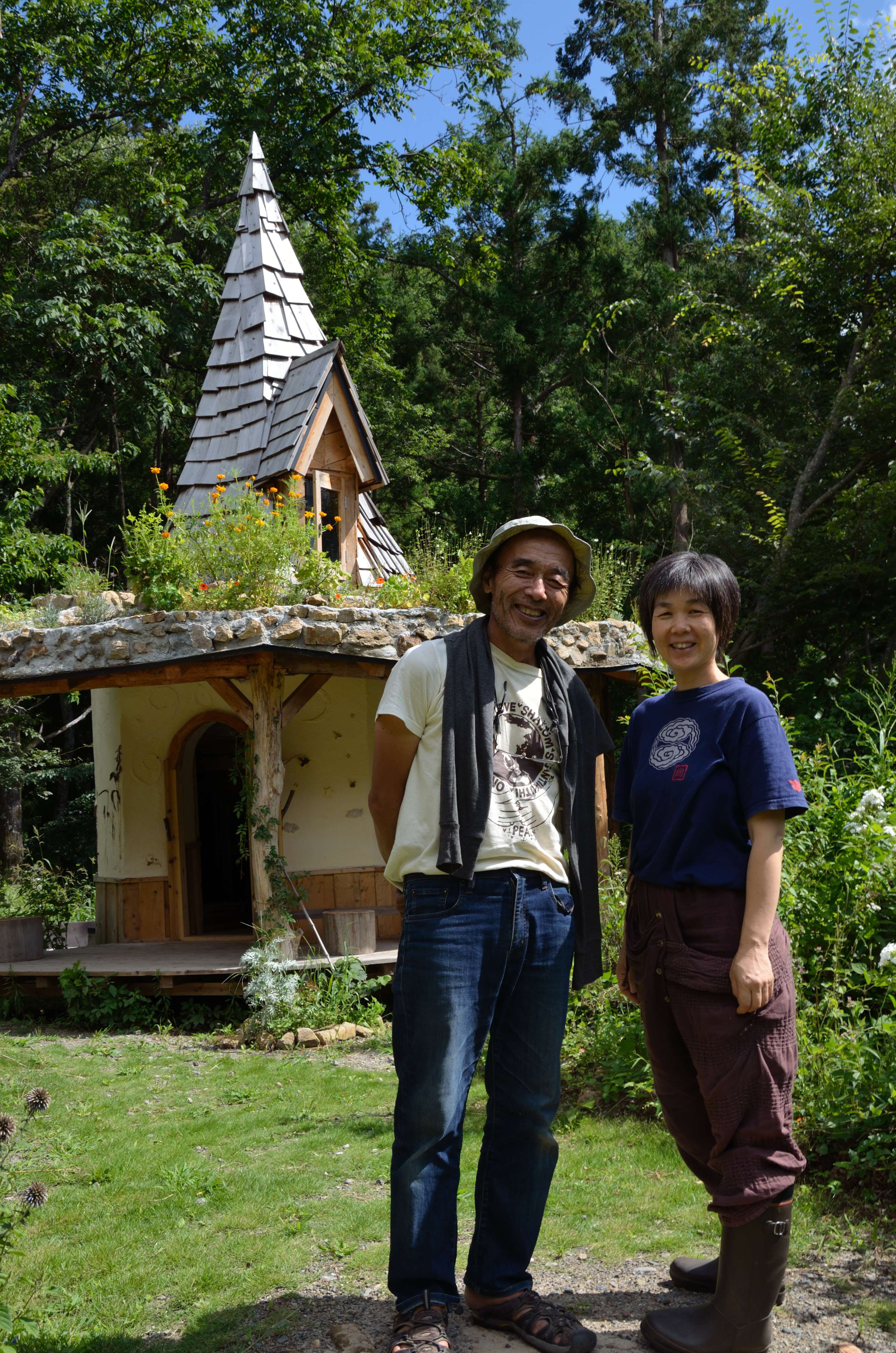 In a sunny corner of Tomoko and Kenji Usui's garden, surrounded by marigolds and goldenrod, there stands a peculiar little house. The thatched roof is tall and pointy like a witch's hat, with flowers growing around the brim. The porch is wide and shady, with a handmade wooden chair on it inviting visitors to take a rest. Imprinted in its plaster walls are stars made of wheat, pumpkin-seed hearts — and a fragment of a poem by Rumi, a 13th-century Persian mystic, spelled out in buckwheat: "Unfold your own myth."