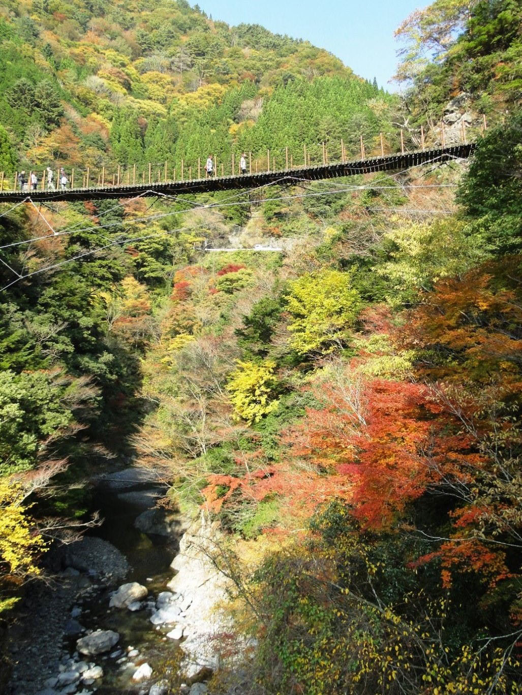 A brief stretch of easy driving brings us to the Umenoki Todoro suspension bridge, a mostly solid-under-the-feet construction that spans a gorge peppered with autumn hues. I keep my toddler's hand firmly entrenched in mine as I attempt shot after digital shot to capture the beauty of the scene but my camera screen shows only a pale imitation of the palette my eyes can see.