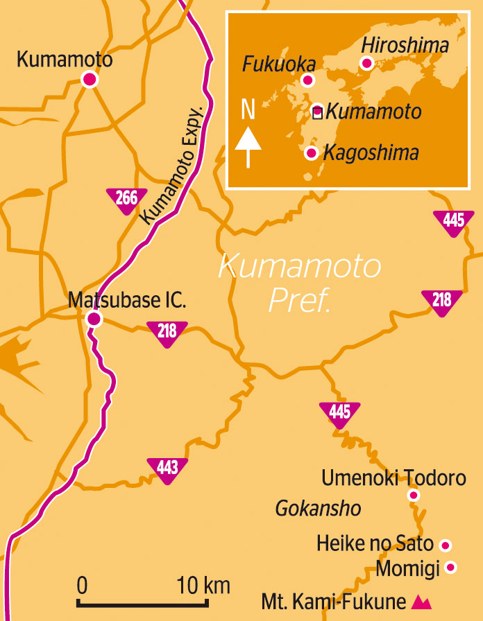 I've been dreading this moment since we turned onto Route 445, a twisting "highway" that leads up into the mountains of Gokanosho in southern Kumamoto Prefecture. On an island not particularly known for its autumn colors, the Gokanosho region serves up some stunning foliage to Kyushu denizens. So impressive are the leaves that thousands flock here over a few weekends in late October and November, making the treacherous mountain lanes a serious test of one's driving skills. On a few select days in November, a brigade of citizen volunteers turns out to enforce a route of one-way roads, easing the congestion on the narrow byways. Unfortunately, we're here the day before the rules are enforced, and it's time to test my vehicular capabilities.