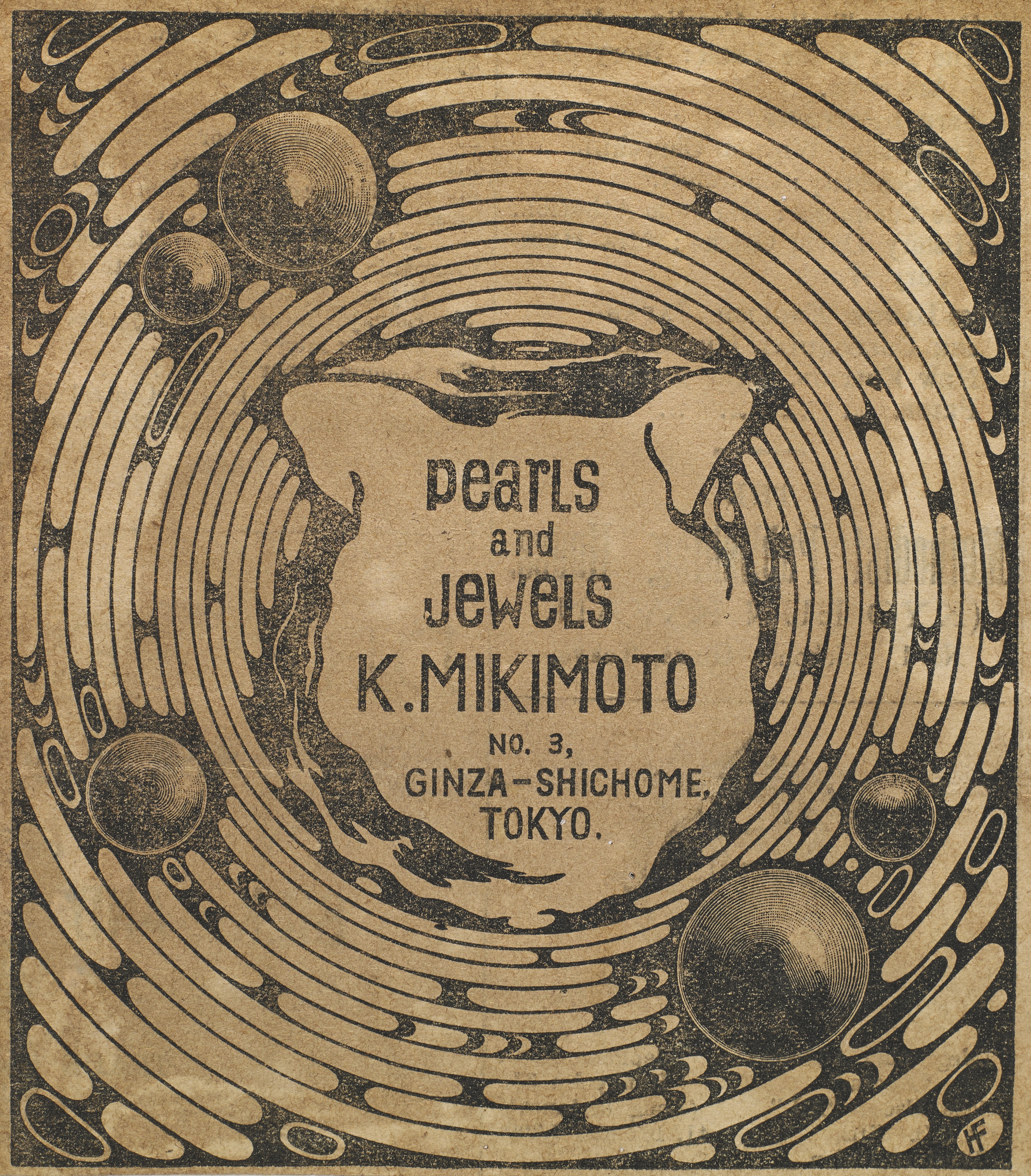 "Pearls and Jewels," proclaims a Mikimoto advertisement from the May 27, 1905, issue of The Japan Times. The text radiates dynamically from a pearl pendant at the advertisement's right, while an oyster shell is placed at the left, no doubt intended as a reminder of Kokichi's then-recent pearl-culturing discovery.