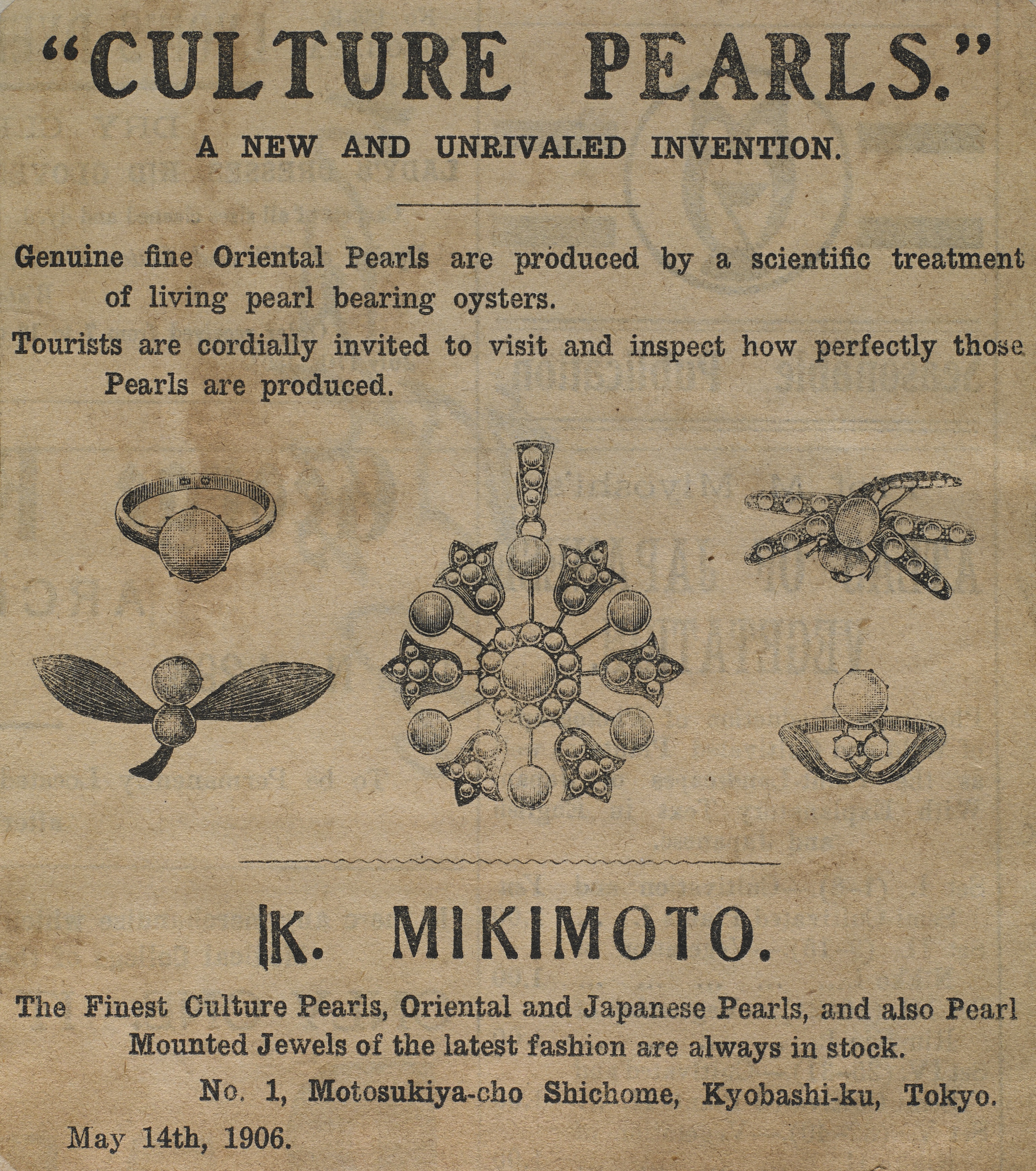 Later ads are more specifically directed at temporary visitors to these shores. "Culture Pearls. A new and unrivaled invention," states one, before noting that "Tourists are cordially invited to visit and to inspect how perfectly those pearls are produced."