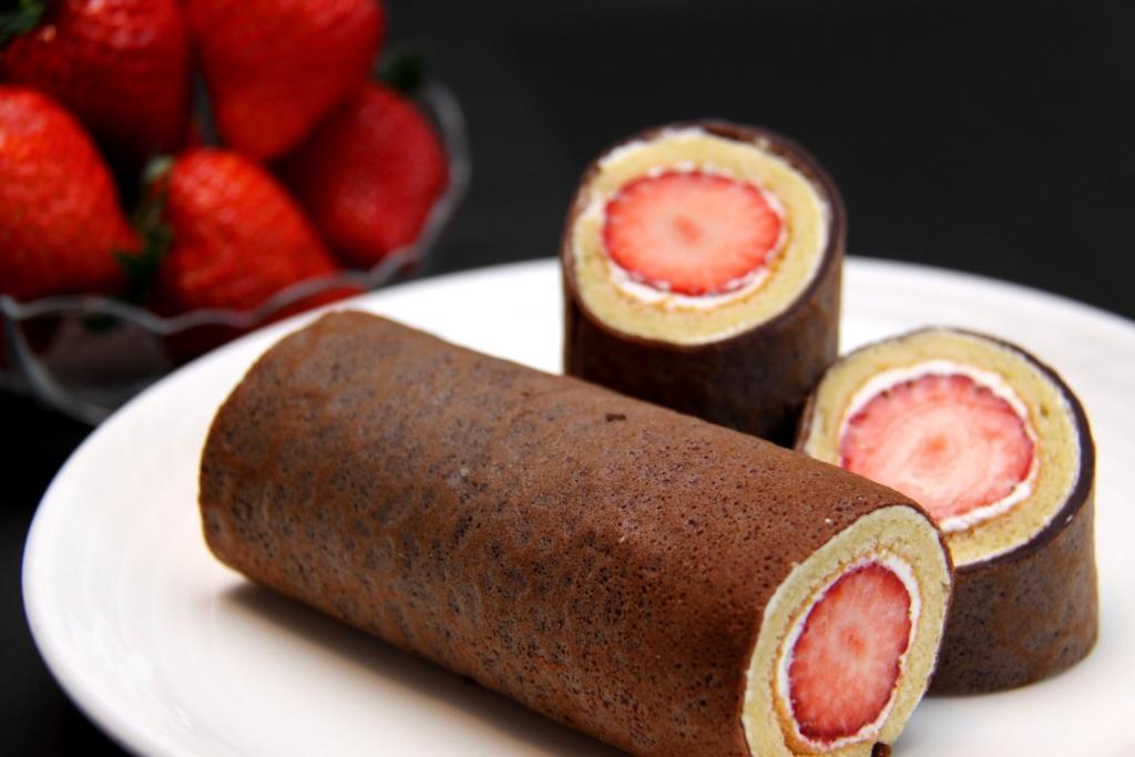 Five large strawberries and whipped cream are wrapped in an almond flavored sponge cake covered with a cocoa crepe, making the cake look very much like a sushi roll. Mango roll cakes will also be offered. The sweet whipped cream and the tanginess of the fruit make a perfect combination.