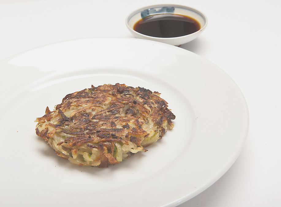 In the recipe to the left for a kind of nattō rosti, the pungency of the fermented beans is reduced both by cooking them and by adding green onion and sesame oil, plus the yuzu sanshō in the dipping sauce. The starch in the potatoes and the stickiness of the nattō hold the pancakes together without any egg or flour binder. Use either whole-bean or split-bean (hikiwari) nattō.