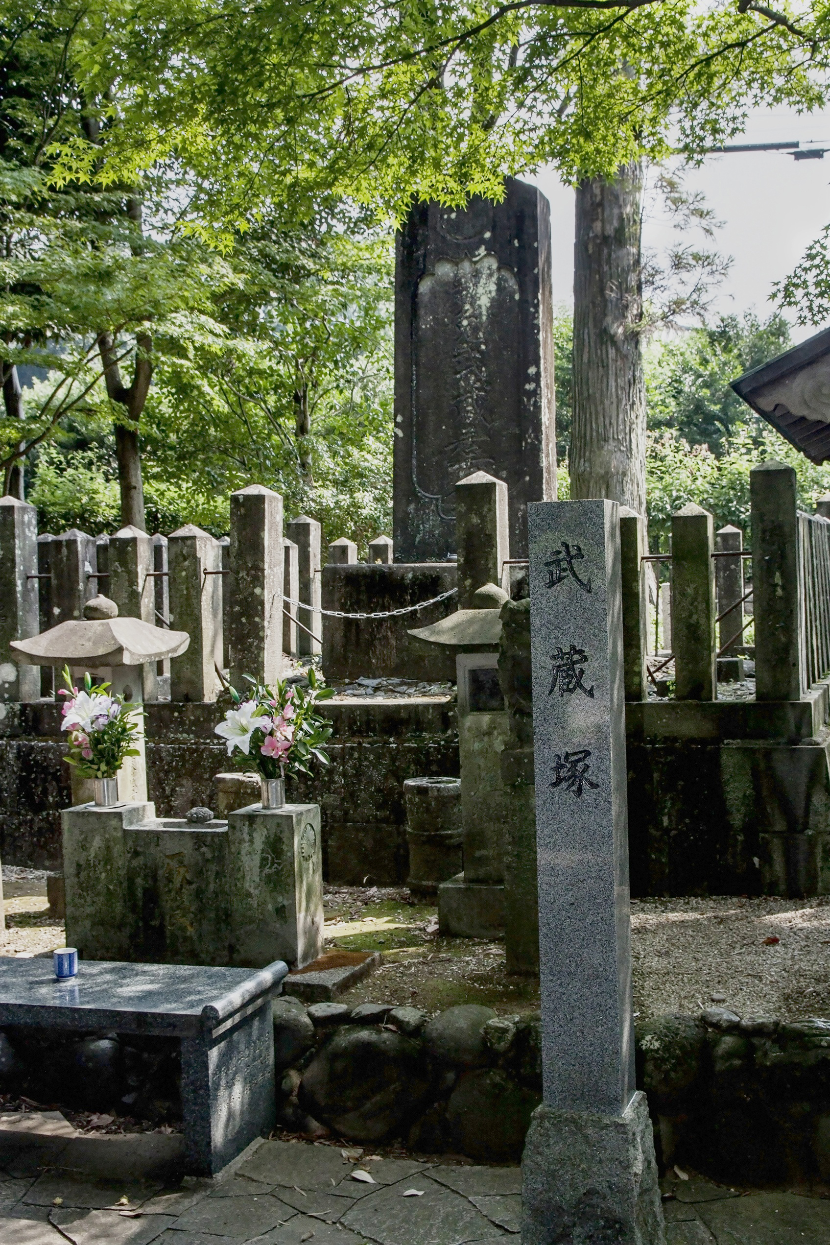 On the day of his funeral, Musashi was dressed in a full suit of armor and a procession carried him to the burial site. Near Taishoji Temple the procession stopped and, as the priest Shunzan was chanting some prayers, it is said that there was a sudden and mighty clap of thunder. At the grave site, by the old road leading out of town, Musashi was buried in an upright position from where — according to his wishes — he could forever watch over the line of Hosokawa lords traveling up to Edo (modern-day Tokyo).