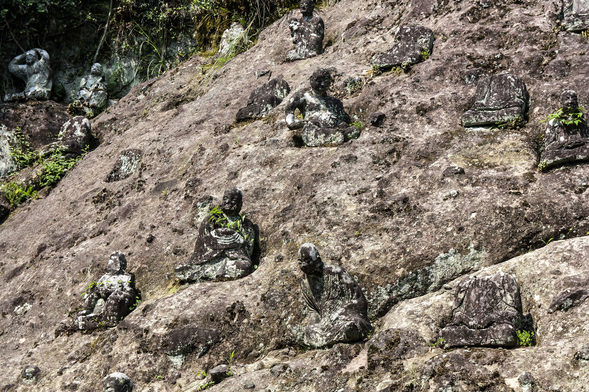 The path leading to the cave skirted the rocky face of a hill that was dotted with Buddhist stone statues known as rakan. According to tradition, if you inspect the faces of the rakan, you are bound to find one that resembles someone you know.