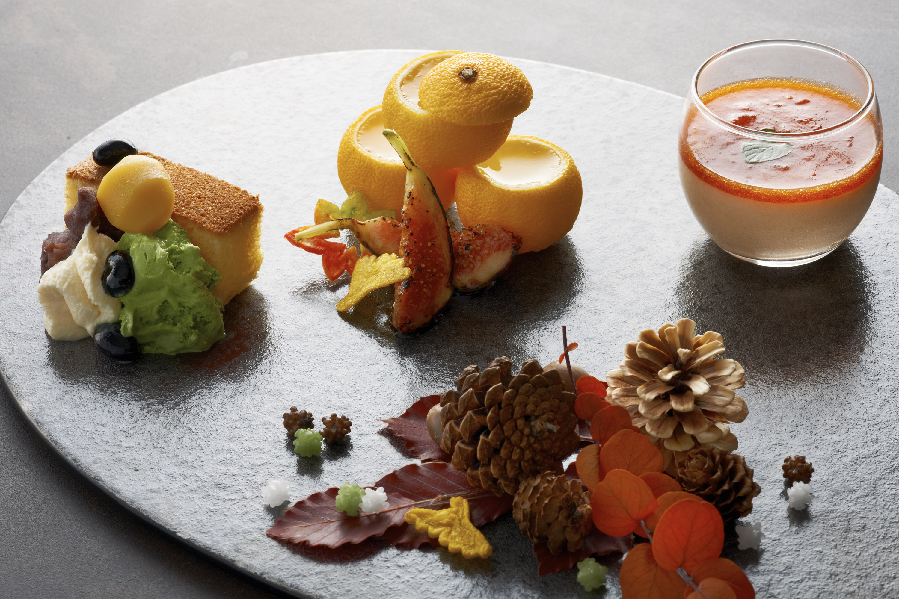 Through October, the restaurant will offer unique autumn desserts for each course menu. Kazahana's desserts are among the most popular with those in the know. With abundant autumn harvests such as sweet chestnuts, figs and persimmons, each dessert adds beautiful color to tables. During this period, each dessert is also be available a la carte from ¥1,300.