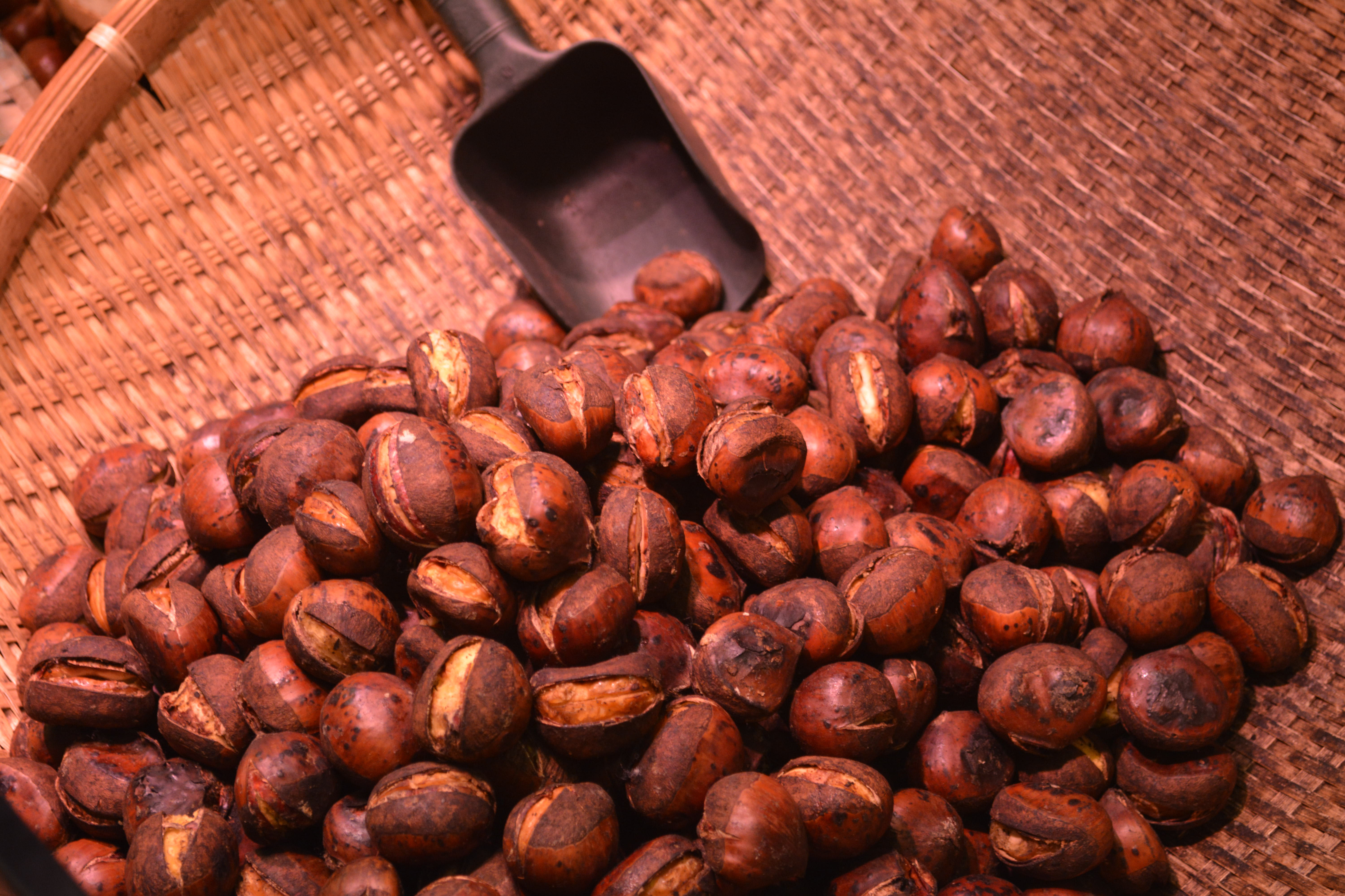 At Kyotanba (075-212-0989; www.tanba-nouhan.com), the rich musty smell of roasted chestnuts fills the air. Tanba, a region in northern Kyoto abutting the Sea of Japan, is synonymous with chestnuts and matsutake. One of the roasters told me that the chilly mornings and hot days are ideal growing conditions for nuts and fungus.