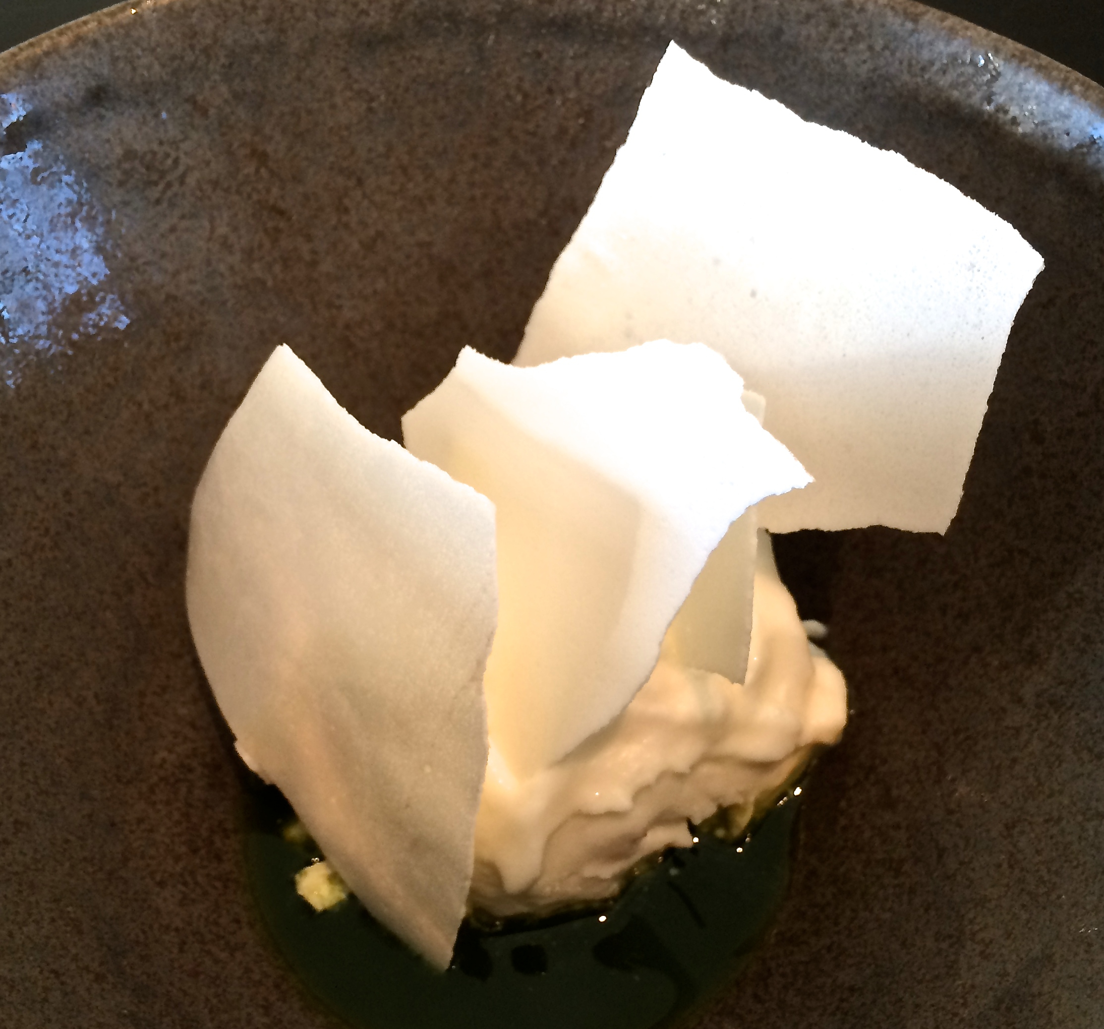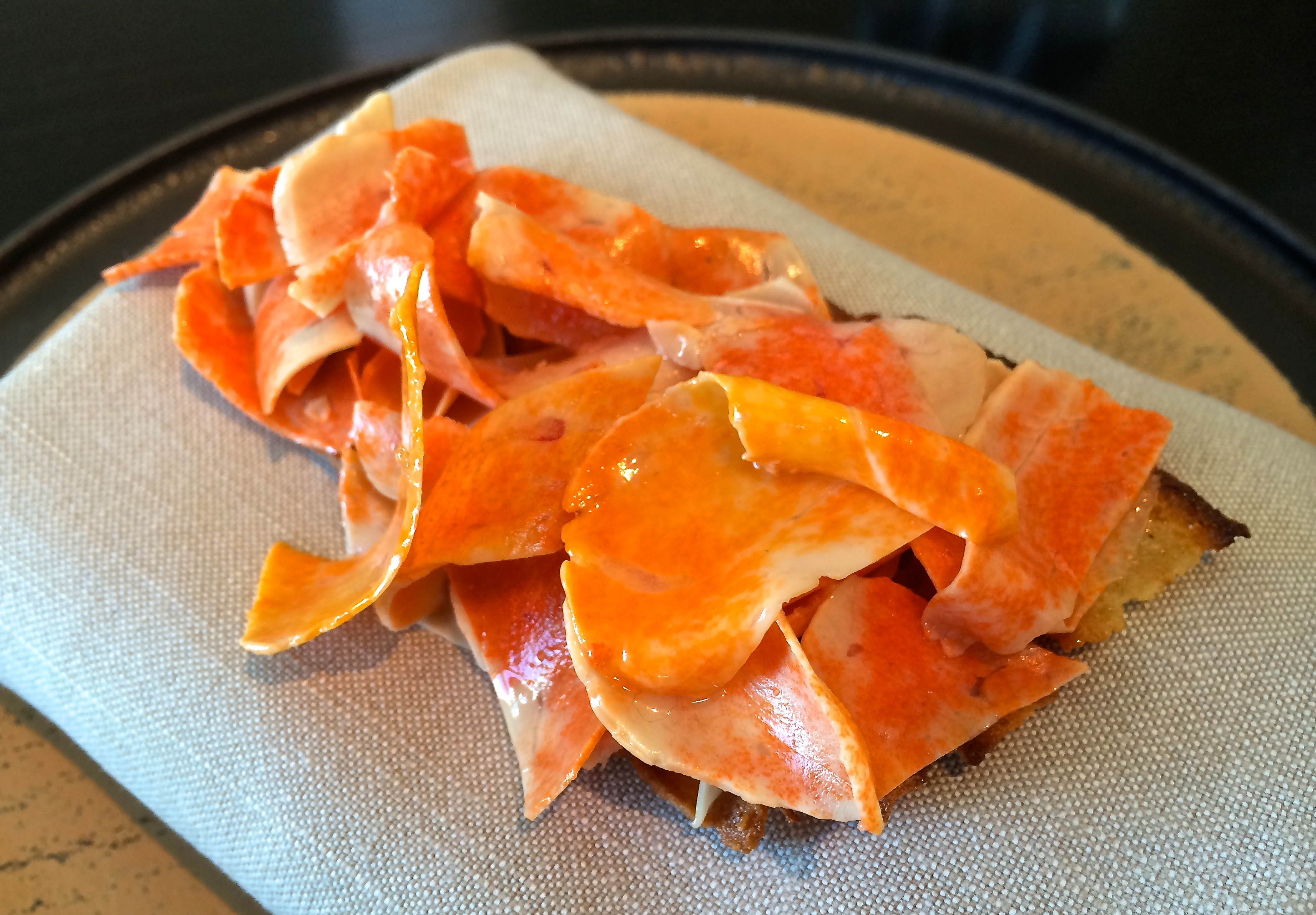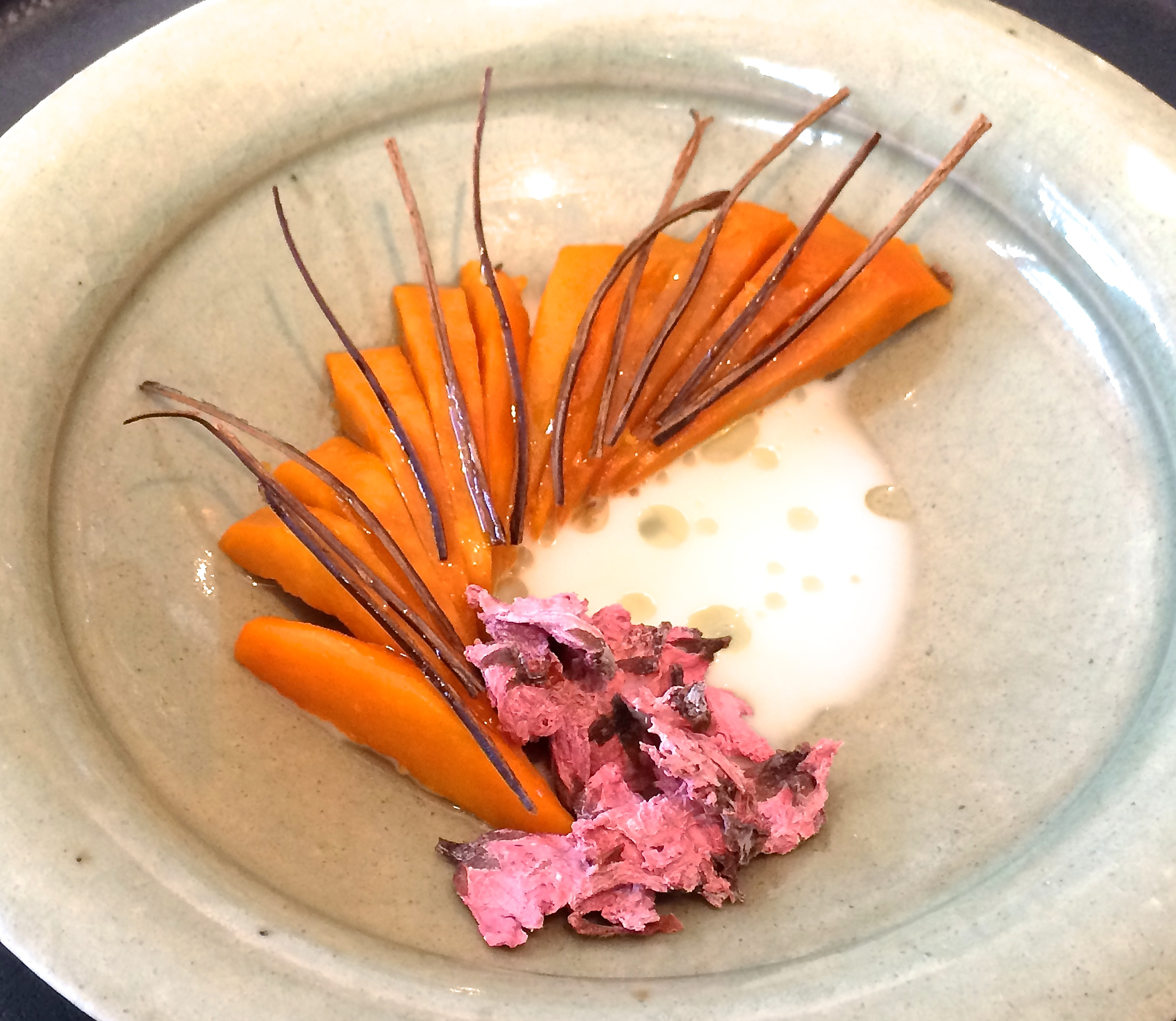Four varieties of citrus adorned with sansho herb, piquant pickled Okinawan peppers and roast konbu seaweed oil; monkfish liver smoked, frozen and shaved onto crisp bread with a tart, zinging sauce of wild kiwi. And, one of the prettiest dishes of the meal, slivers of simmered pumpkin paired with salted cherry blossoms.